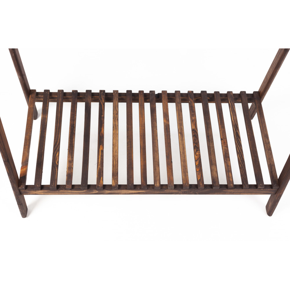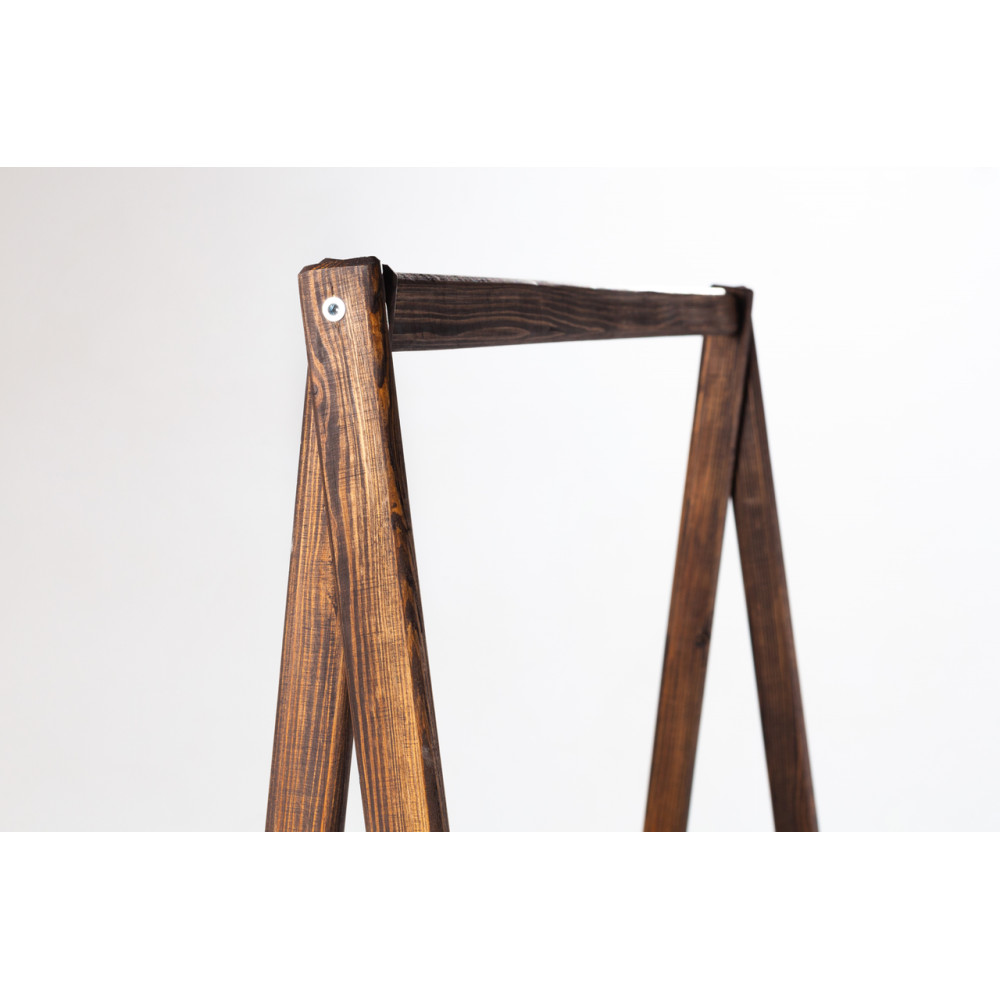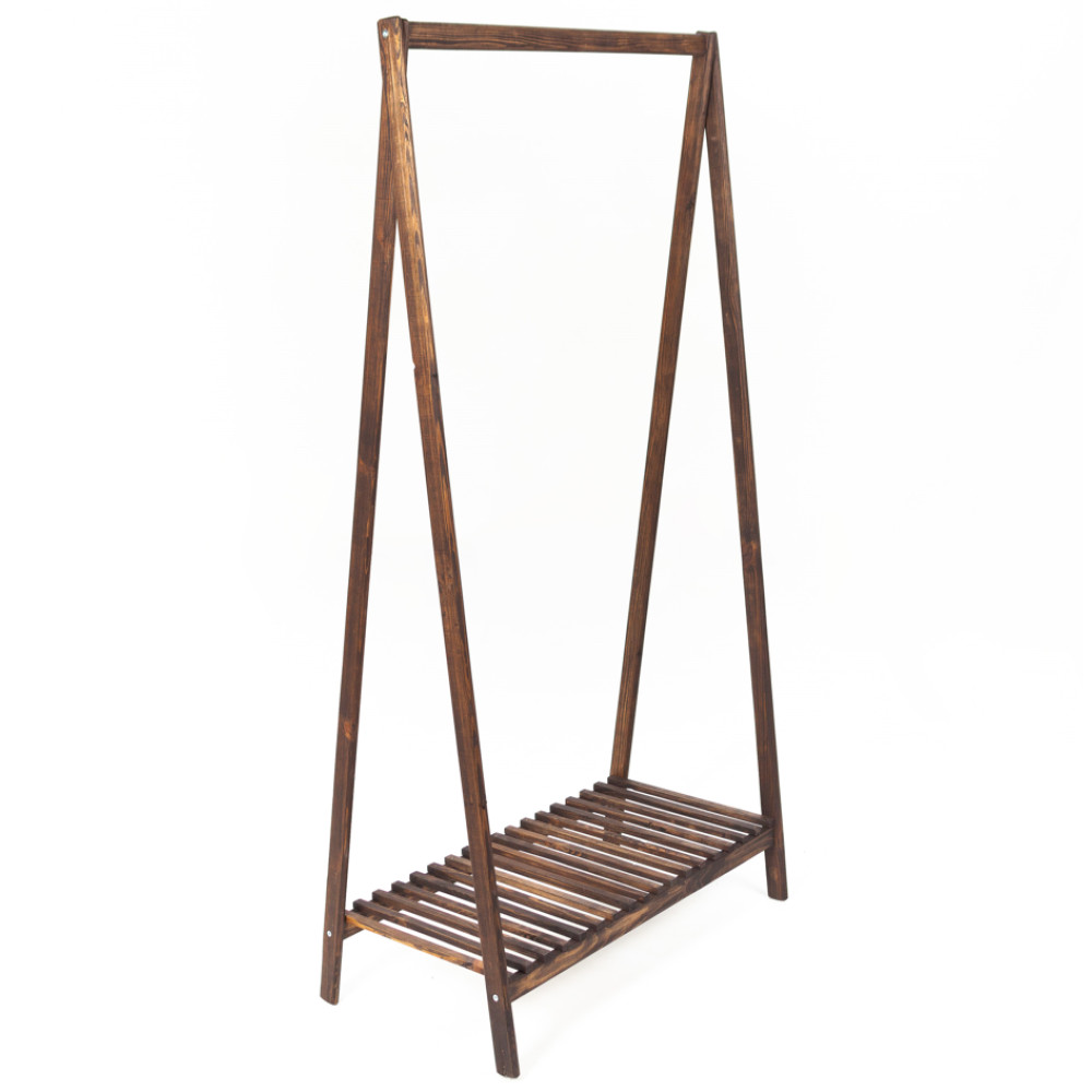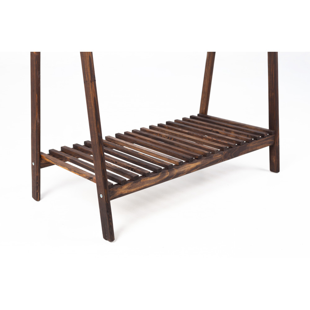 Напольная вешалка ручной работы из прочной древесины. Стальные перекладины, на которых размещаются плечики, способны выдержать внушительное количество одежды до 30 кг. В нижней части стойки находиться полка, предназначенная для размещения обуви или других вещей.