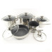 В набор входят кастрюли разного объема c крышками, ковш и сковорода из высокопрочной нержавеющей стали, не подвергающейся коррозии и потускнению. Внутренняя часть имеет мраморное покрытие. Нержавеющая сталь отличается высокой теплопроводностью и распределением температуры, благодаря чему происходит быстрое нагревание и длительное удержание тепла.