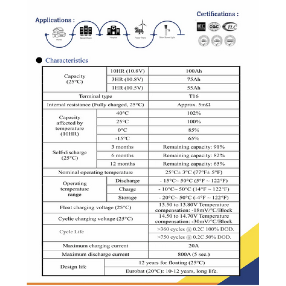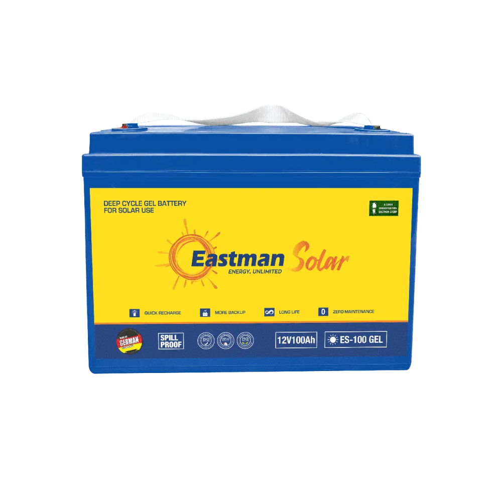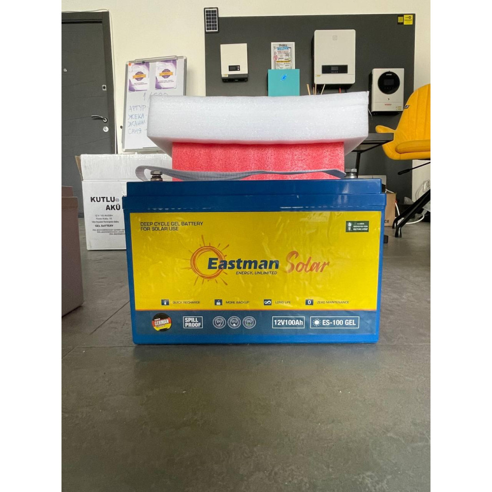 Eastman Solar ES-100 GEL 12V 100Ah – підвищена надійність та з тривалим терміном служби акумулятор гелевого типу. При номінальній напрузі 12 і великої ємності 100Ач дана модель відмінно підходить для джерел безперебійного живлення під завдання підтримки працездатності техніки в умовах відсутності основного джерела постачання на тривалий час. Струм заряду в максимумі 20 Амперів, максимальний струм розряду 800 Амперів (тривалістю 5 секунд).