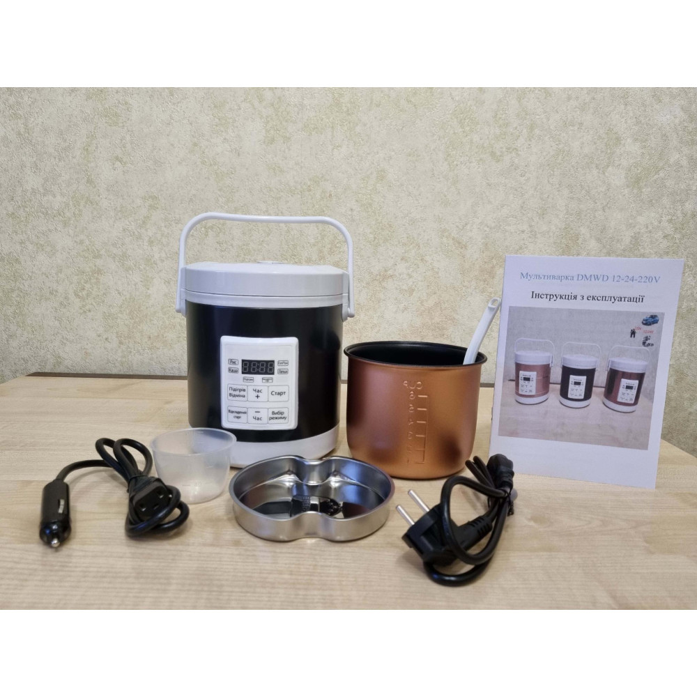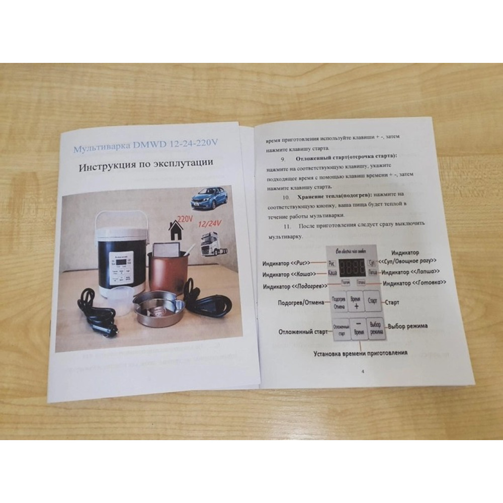 Мультиварка працює від прикурювача напругою 12 і 24 Вольта, є в комплекті універсальний шнур, що запобігає можливості неправильного підключення.