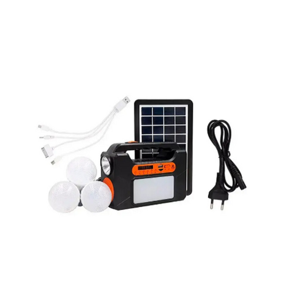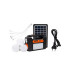 Ліхтар PowerBank EP-393BT радіо/блютуз, 1 х сонячна панель, 1 х USB-кабель для зарядки, 3х лампочки з кабелем та гніздом, Інструкція, Заводська упаковка.