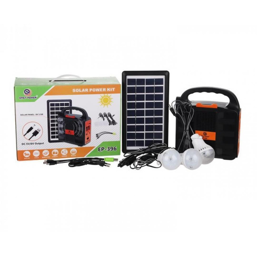 Зовнішній акумулятор бездротовий портативний із сонячною батареєю для кемпінгу та будинку + 3 лампи Easy Power 4000mAh FM, Bluetooth, TF (EP-396). У комплект входять 3 світлодіодні лампи з кабелями. Має USB вихід для заряджання пристроїв, вбудований динамік для відтворення музики з флешки, через Bluetooth або FM радіо.