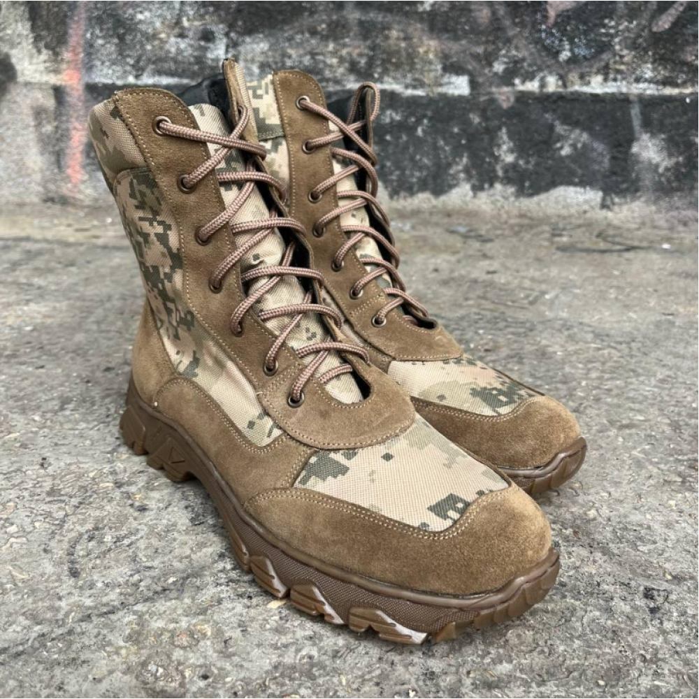 Берці весна/літо (койот-піксель). Виготовлені з натуральної цупкої шкіри із посиленою устілкою і вставок з Кордури. Призначені для пересіченої місцевості.