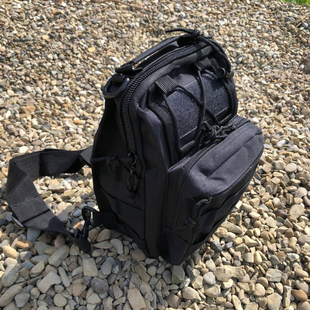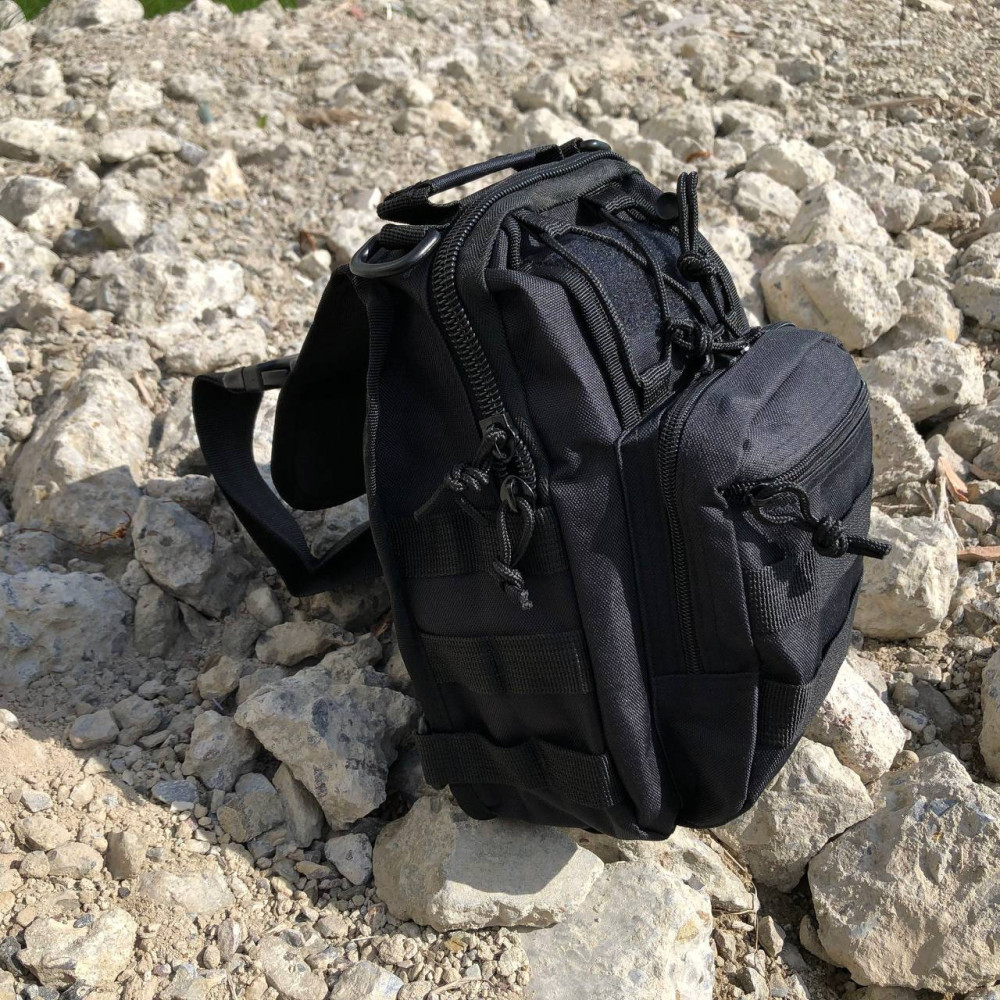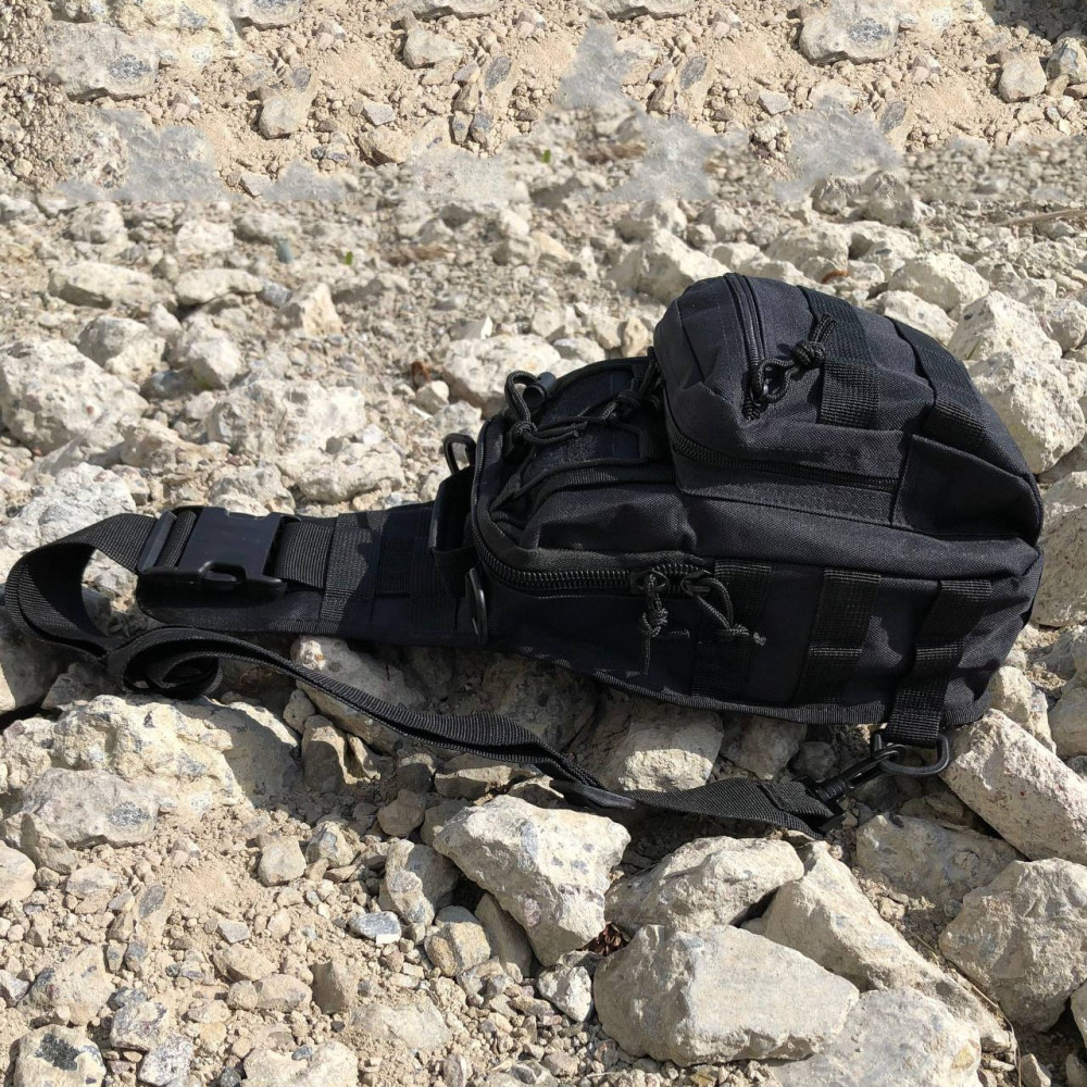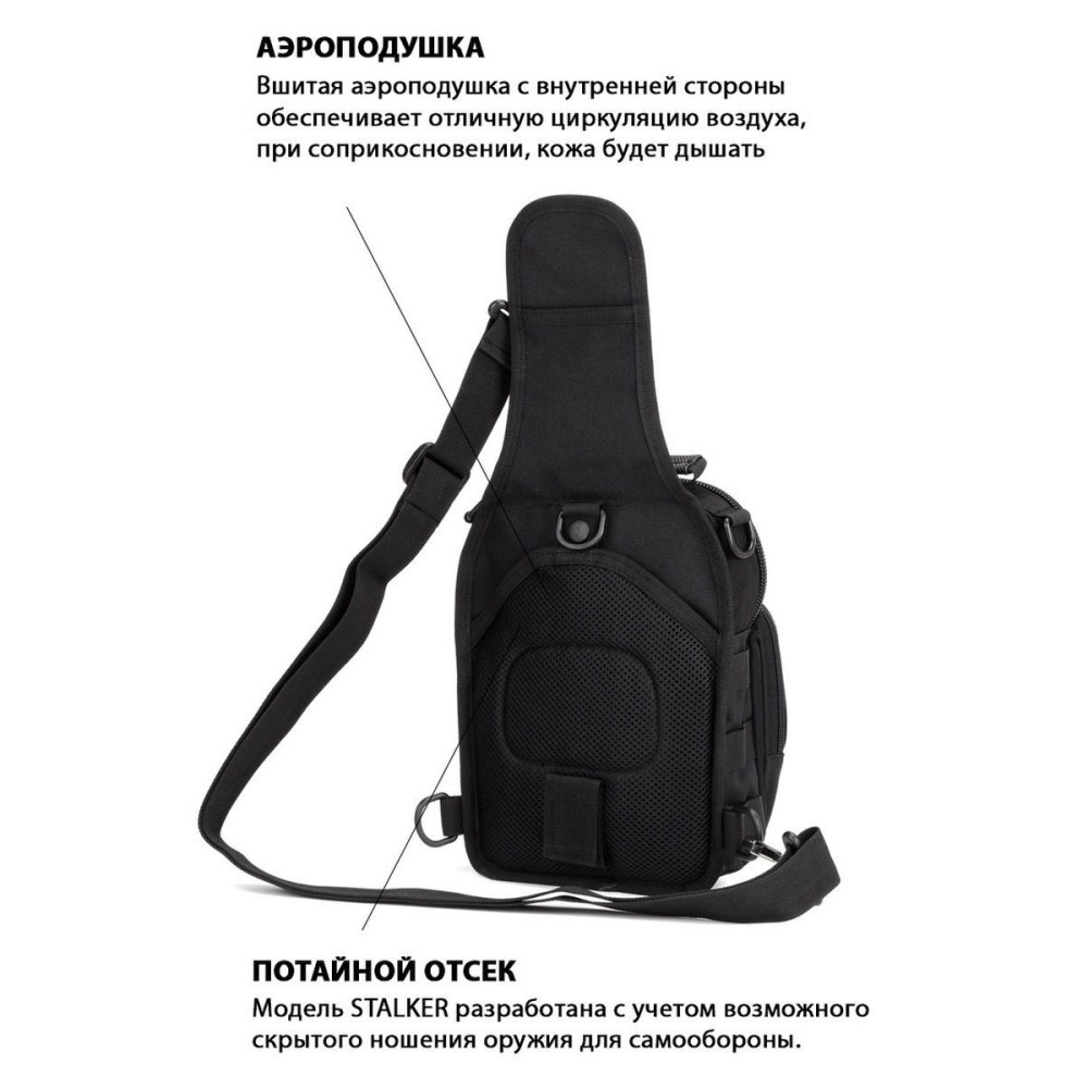 Сумка-слінг має один основний відділ і одну велику зовнішню кишеню на замку (16х16х5см). Обидва відділи мають люверси на дні сумки (отвори) для вентиляції та відведення вологи. П'ять пластикових кілець-кріплень дозволяють фіксувати ремінь з карабінами, відповідно до Ваших потреб, або за допомогою кільцевої кнопки просто трансформувати сумку в барсетку. Сумка також має коротку ручку.