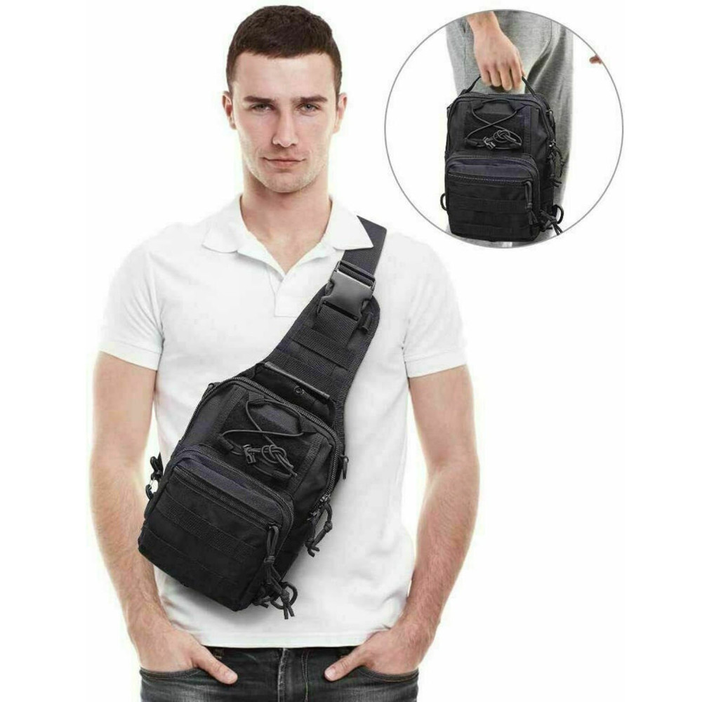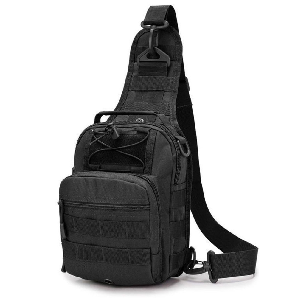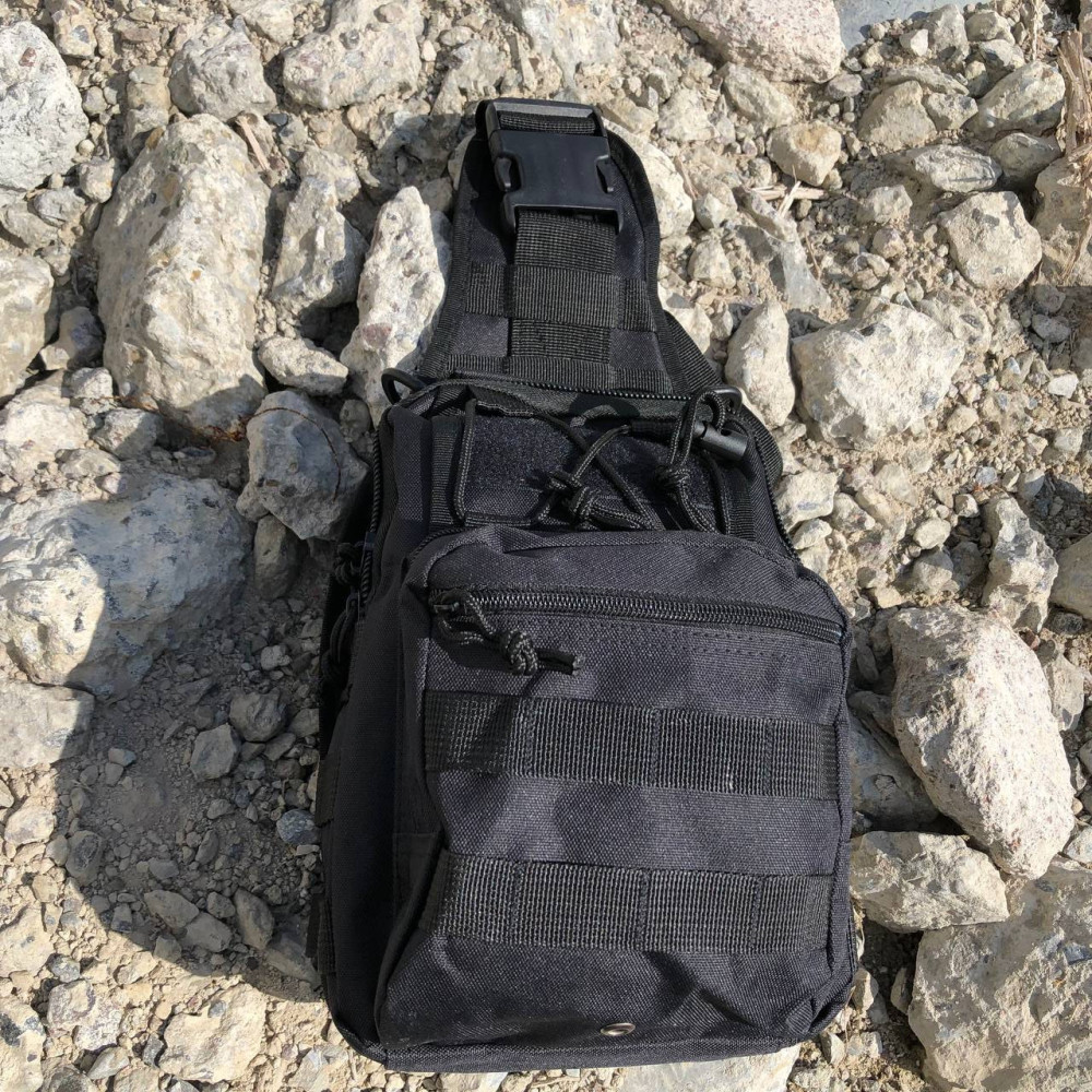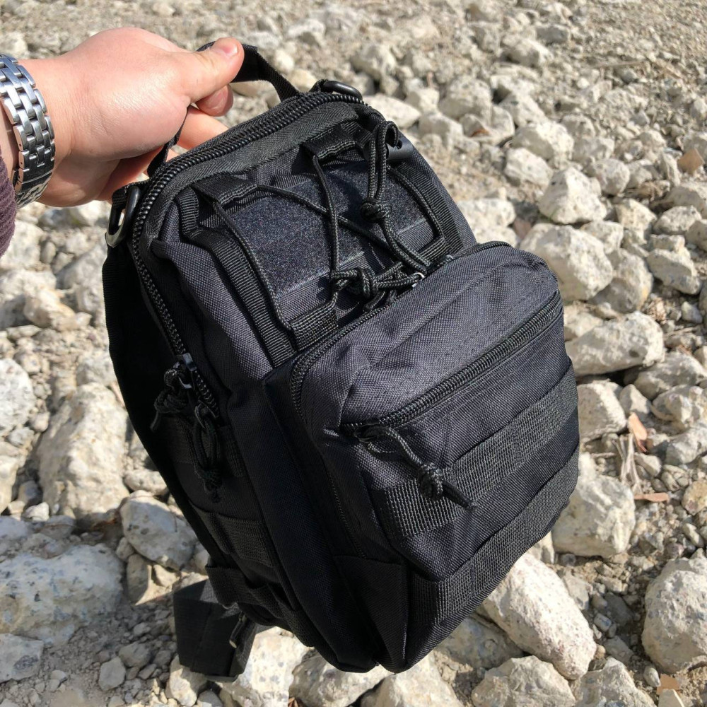 Сумка-слінг має один основний відділ і одну велику зовнішню кишеню на замку (16х16х5см). Обидва відділи мають люверси на дні сумки (отвори) для вентиляції та відведення вологи. П'ять пластикових кілець-кріплень дозволяють фіксувати ремінь з карабінами, відповідно до Ваших потреб, або за допомогою кільцевої кнопки просто трансформувати сумку в барсетку. Сумка також має коротку ручку.