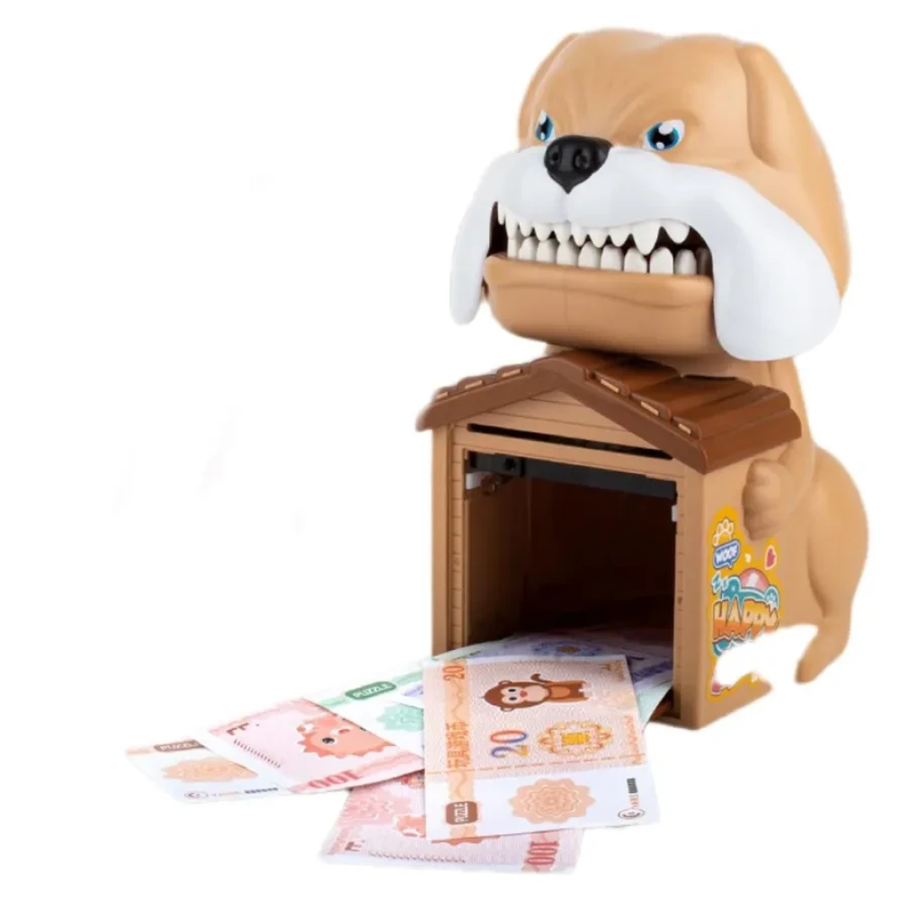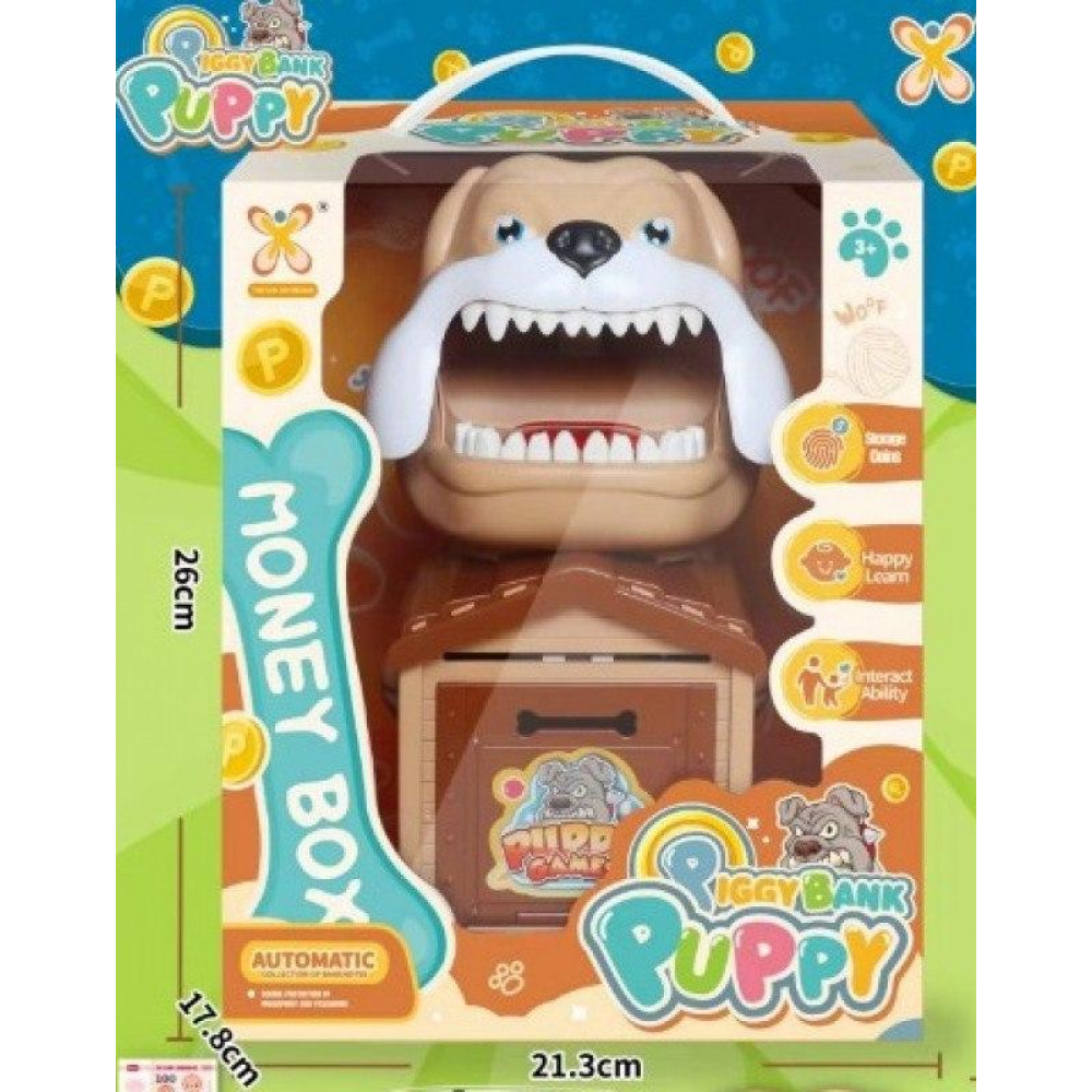 Особливість цієї скарбнички полягає у її функціоналі, привертає увагу надзвичайно яскравим дизайном, імітує звуки тварин, грає мелодії та відтворює звуки музичних інструментів. На будиночку встановлено персональний банкомат із паролем, а зубки злого песика – це цифрова клавіатура. Для надійності додано ігрову пластину для відбитка пальця. Банкомат підходить для дрібниці та для купюр. Скарбничка оснащена кодовим замком, якщо не правильно ввести код, то пес вкусить за палець. Ця функція дуже подобається дорослим і тішить дітей. Сейф-скарбничка має привабливий зовнішній вигляд, підходить для хлопчиків та дівчаток у подарунок.