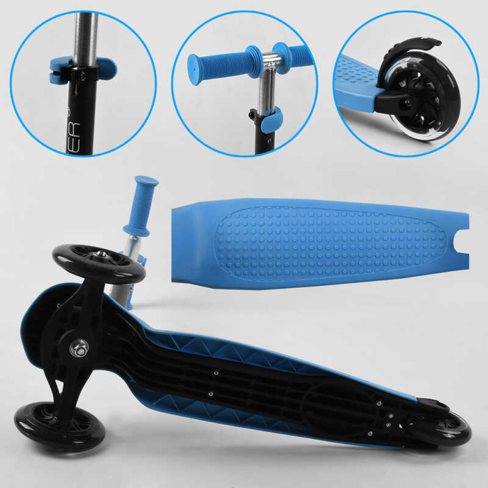 - Кермо самоката має 3 положення для фіксації та регулюється по висоті від 55 см до 69 см.