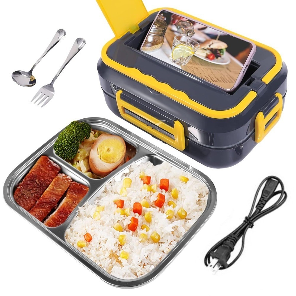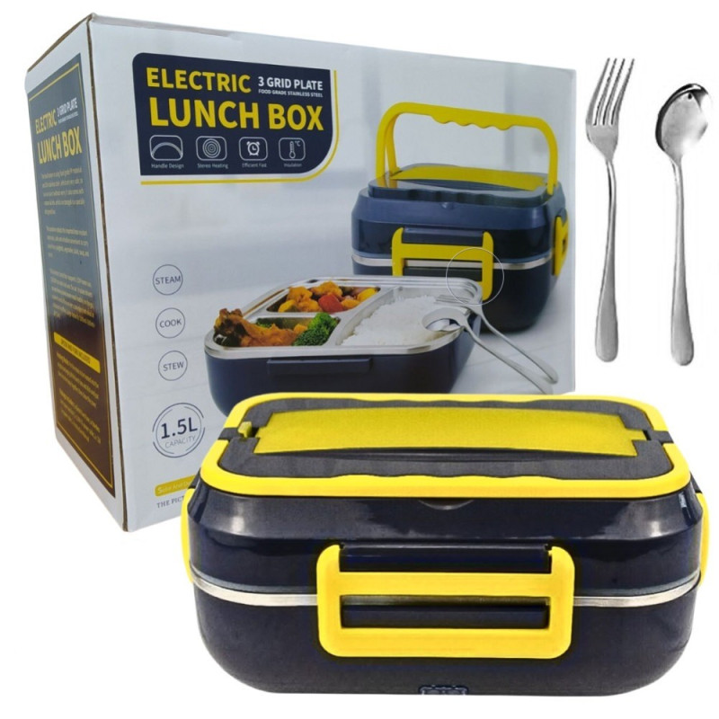 Електричний обід бокс із підігрівом – це функціональний, місткий та зручний контейнер для їжі з двома ємностями та ложкою. Перевагою моделі є здатність зберігати температуру вміщених продуктів, а у разі охолодження – можливість підігріти обід за допомогою вбудованого електронагрівача. Час нагрівання їжі у ланч боксі 20 хв. Відділ першої страви гермічно закривається. У кришці корпусу є спеціальний відсік, де зберігається ложка.