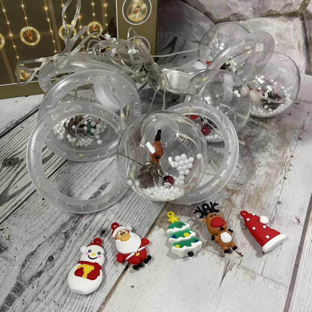 Довжини світлодіодної гірлянди вистачає для декорування невеликого приміщення. Десять великих кілець із фігурками всередині на однаковій відстані один від одного розташовані на прозорому дроті. Оскільки провід прозорий, він не заважає якісному декору та практично не помітний під час роботи гірлянди.