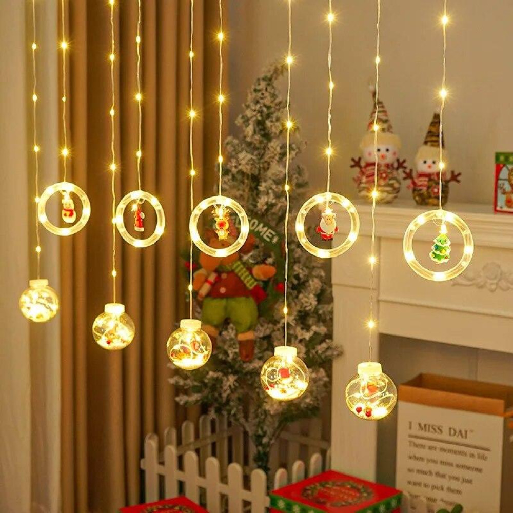 Використовувати таке рішення можна для прикрас віконних отворів, а також декорування приміщення іншим способом. Новорічна гірлянда штора "Кільце з фігурами" має 2.5 м у довжину, що світиться теплим білим світлом.