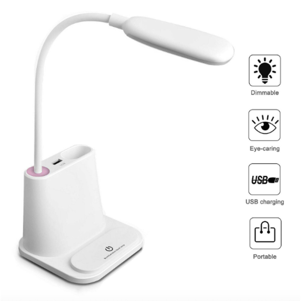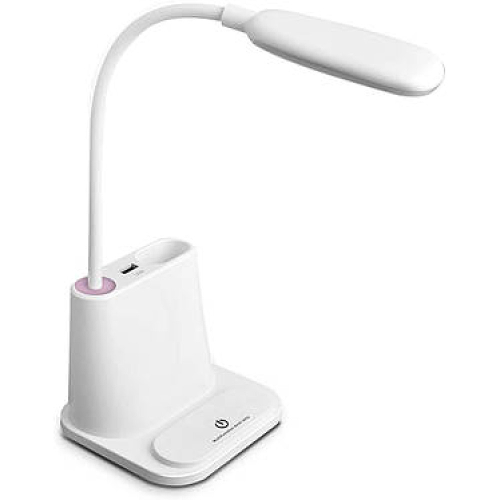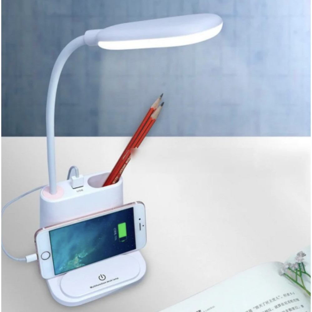 Настільна світлодіодна лампа з вбудованим акумулятором та тримачем для телефону виготовлена з високоякісного пластику приємного на дотик. Має можливість зміни кольору світлового потоку (біле - денне світло, жовте - м'яке світло) і регулювання яскравості свічення.