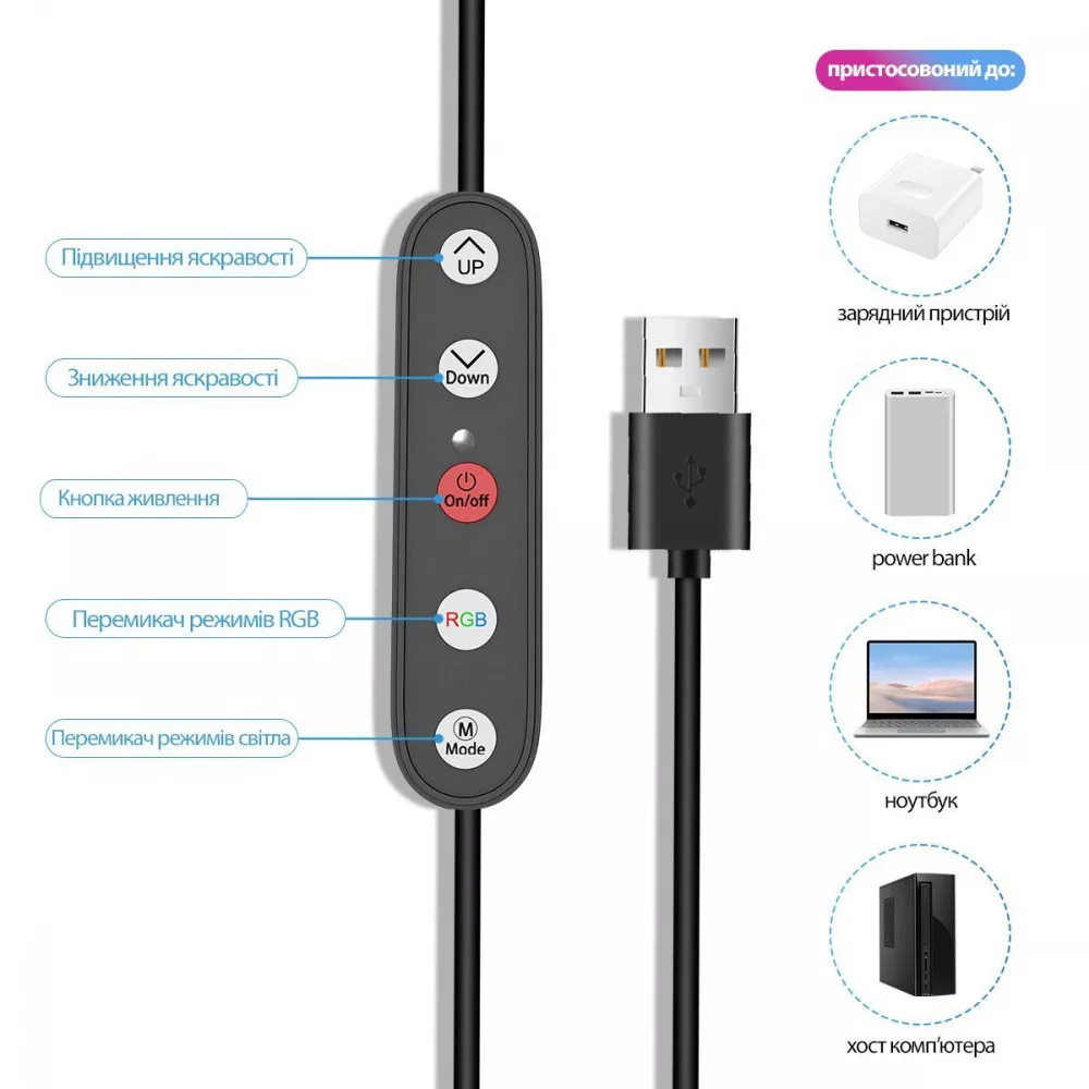 - Функціональність: пропонує 17 режимів освітлення, які можна вибрати залежно від ваших потреб, а також регулювання яскравості для створення ідеального освітлення. Смартфон легко розміщується в центрі світлодіодного кільця для створення якісних кадрів. У комплекті передбачено пульт дистанційного керування, що забезпечує максимальну зручність використання.