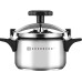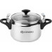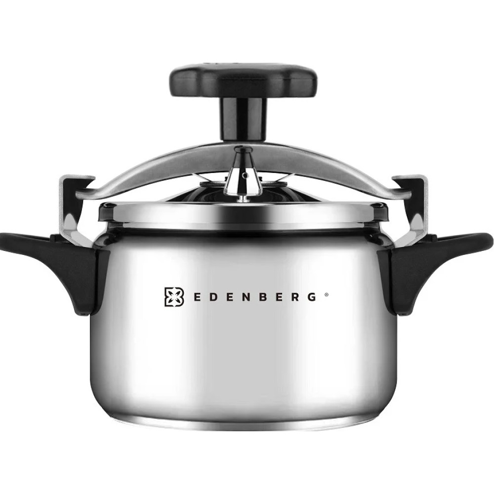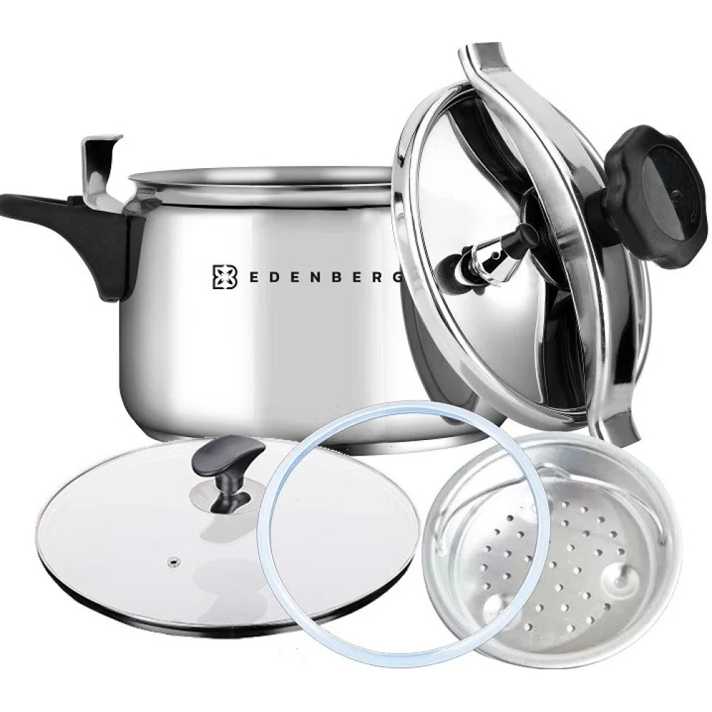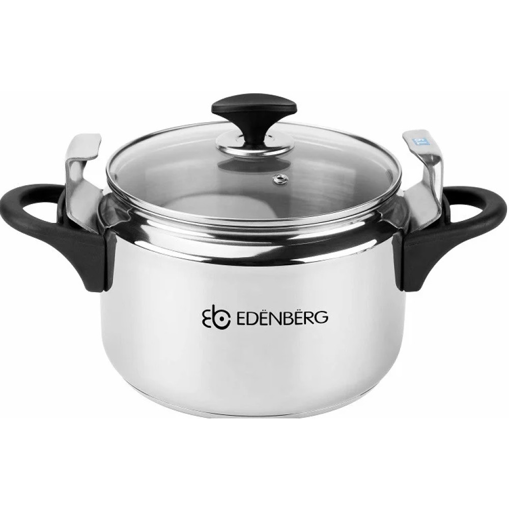 Каструля-скороварка-пароварка із нержавіючої сталі зі скляною кришкою 5 л Edenberg EB-3768 виготовлена з високоякісної нержавіючої сталі. Цей метал використовується у харчовій промисловості та для виготовлення медичних інструментів, оскільки повністю безпечний для здоров'я. Конструкція каструлі є стандартною, а кришка має незвичайну форму. Кришка вигнута, а при закритті розпрямляється та забезпечує герметичність каструлі. Щоб правильно встановити кришку, необхідно вставити її у каструлю, залишаючи скобу кришки нагорі, потім вирівняти кришку і повернути бакелітову ручку до упору. Товсті стінки скороварки не деформуються і не псуються джерел нагріву.