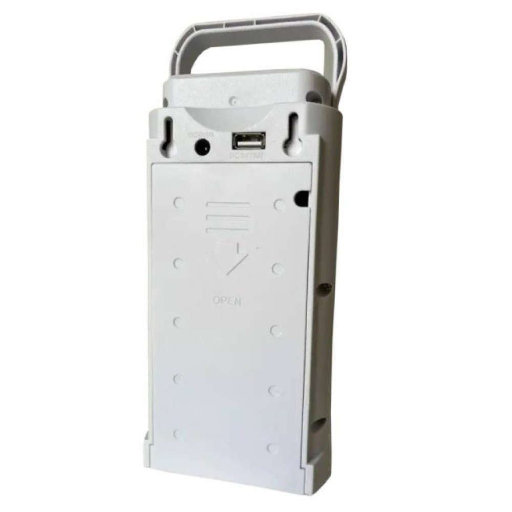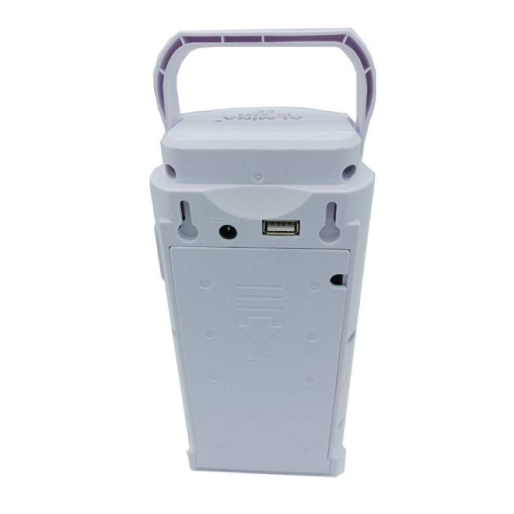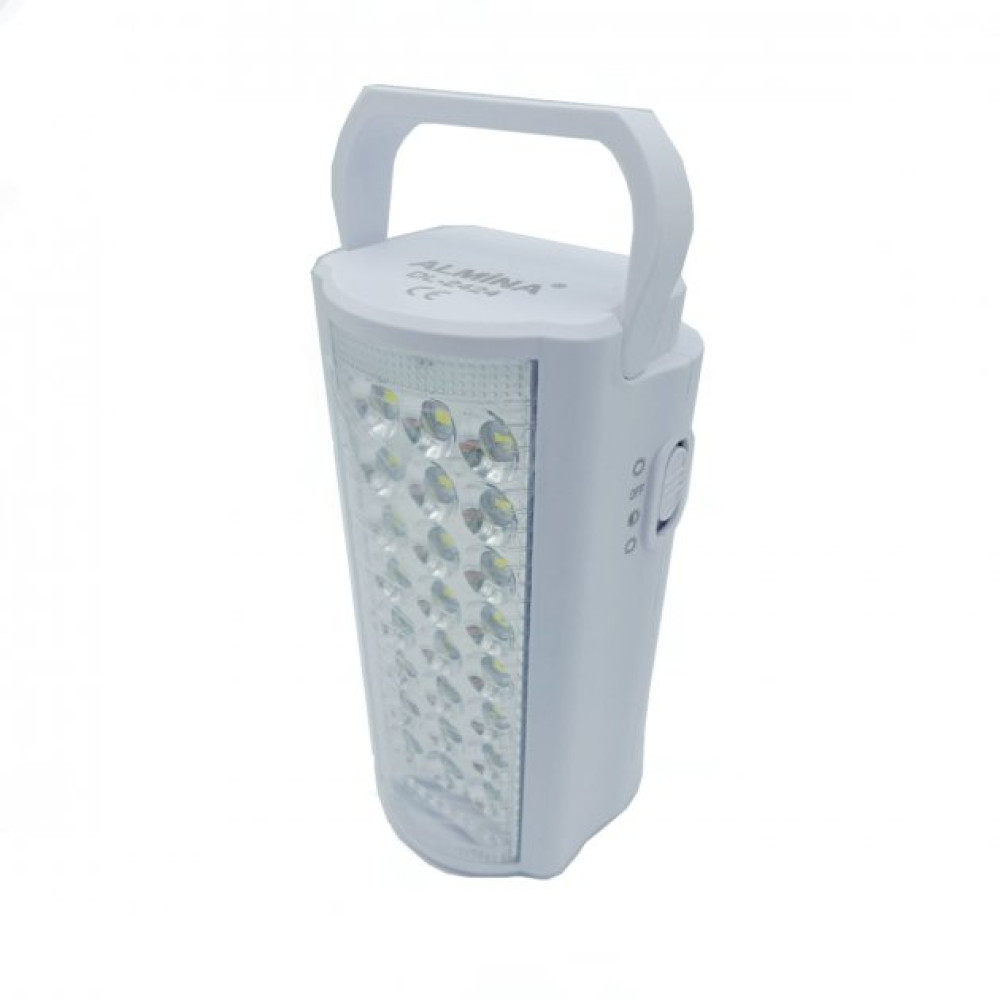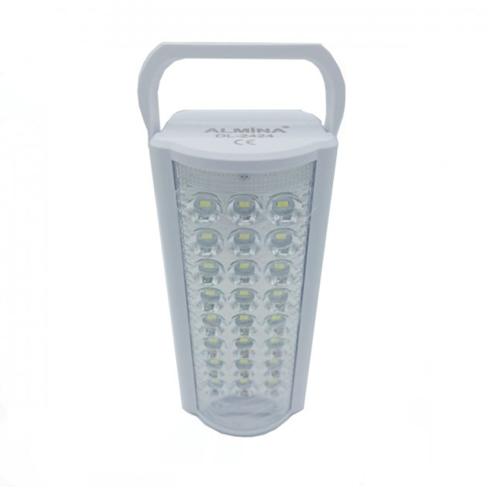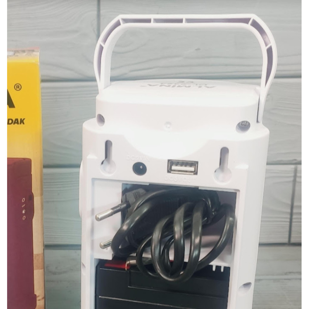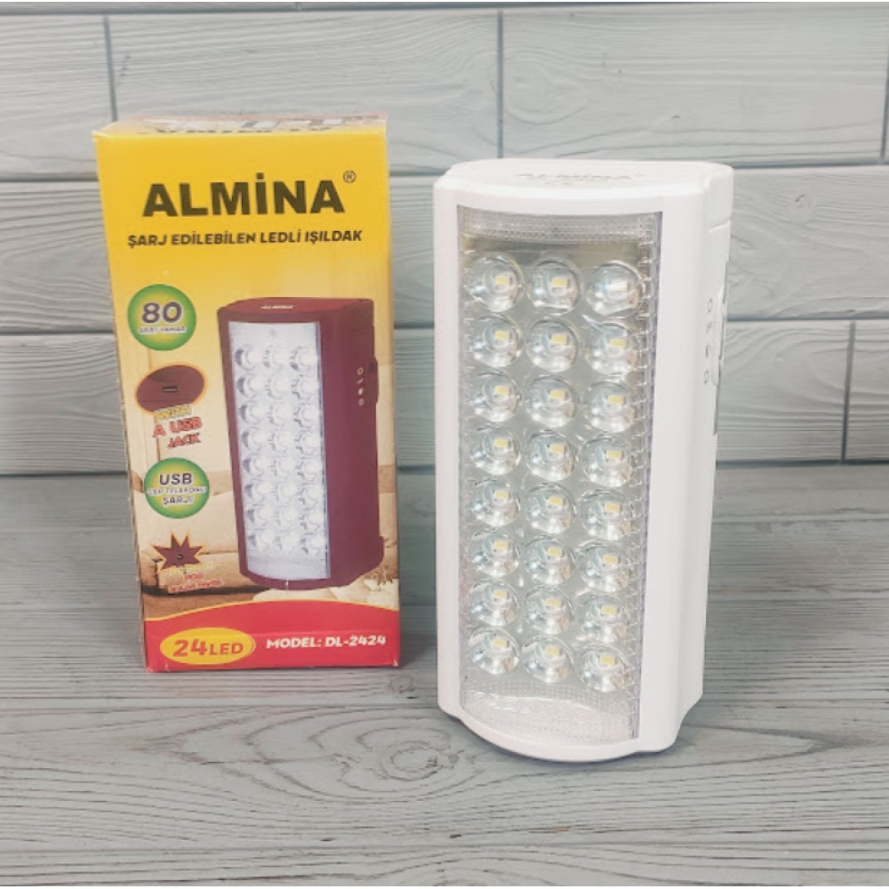 Ліхтар акумуляторний з павербанком Almina DL-2424 24 LED підходить для використання в приміщенні та на відкритому повітрі, таких як ремонт автомобілів, освітлення у приміщенні або риболовля тощо. Свинцево-кислотна акумуляторна батарея 6 V, мережевий шнур знаходиться під задньою кришкою пристрою, для зручності при перенесенні ліхтаря та його легшої зарядки. Зверху є ручка для перенесення ліхтаря та отвори для можливості кріплення на стіну. Яскраві 24 SMD LED світлодіодні ліхтарі дають дуже яскраве світло, а приємним бонусом є наявність роз'єму USB для зарядки смартфона. У ліхтаря два режими освітлення: робота 8 світлодіодів (до 80 годин від одного заряду) та робота 24 світлодіодів (до 30 годин від одного заряду).