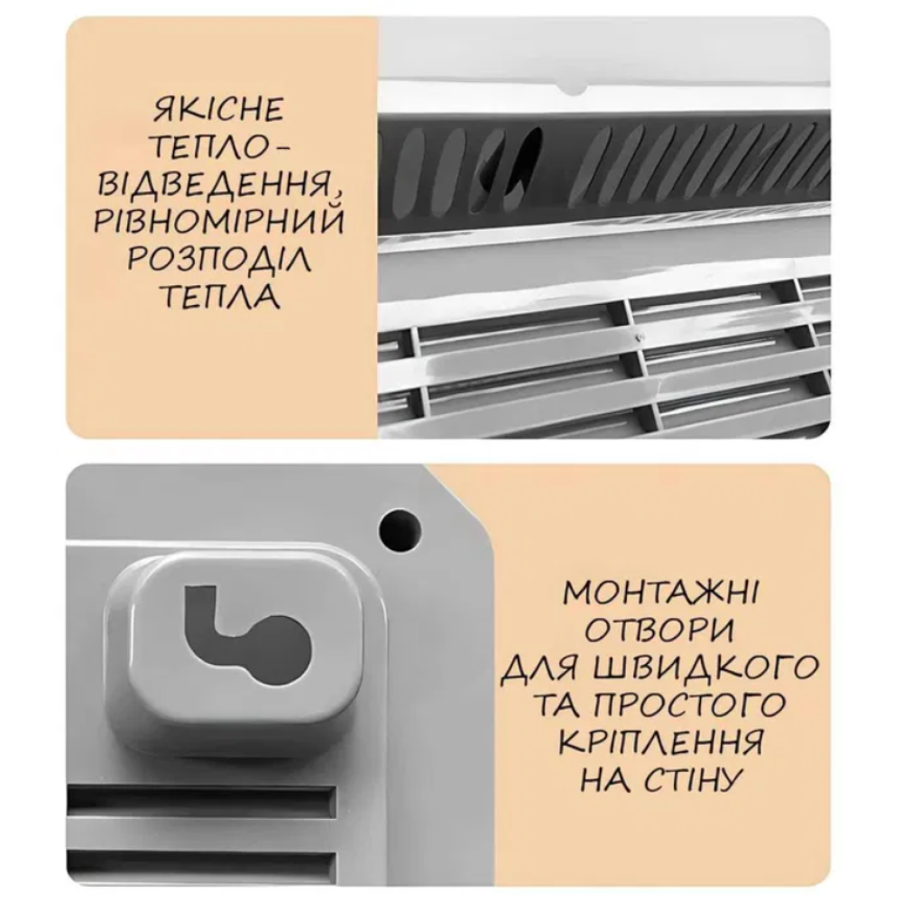 Настінний обігрівач - це ефективний і простий в установці прилад. У швидкі терміни обігріває кімнату, а функція таймера дасть змогу автоматично вимикати прилад у зручні інтервали часу. Модель має LED-індикацію режимів роботи. Для зручності управління в комплекті поставляється пульт управління. Його можна використовувати як вдома, так і в інших приміщеннях. Корпус зроблений з термостійкого пластику, на якому розташовані екран управління. Температуру нагрівання повітря можна регулювати за допомогою пульта і регулятора потужності нагріву. Є функція автономного вимкнення в разі перегріву.