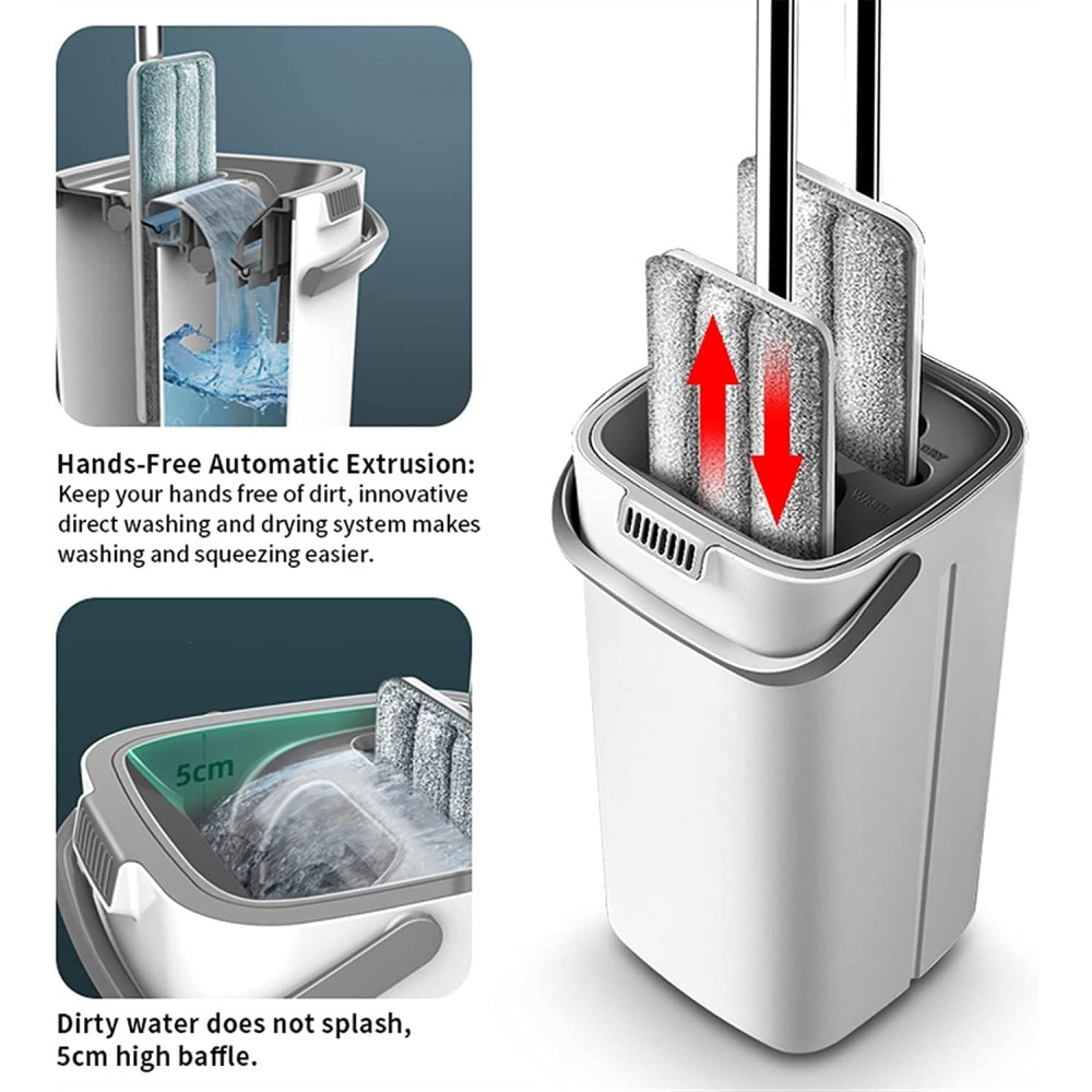 Просто вставте плоску швабру в секцію для миття, щоб очистити насадку від бруду та сміття. Повторіть той самий рух у секції для сушіння, щоб віджати мікрофібру до ідеальної вологості. Вимийте будь-яку поверхню без намокання рук!