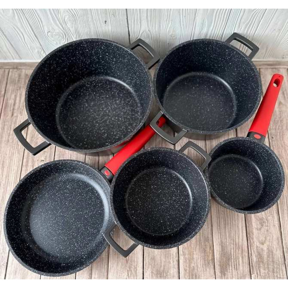 Предмети даного набору виготовлені із кованого алюмінію з високою теплопровідністю. Індукційне дно підходить для всіх типів плит, набагато ефективніше розподіляє теплову енергію, завдяки чому не пригорає їжа. Структура дна має тришарове мармурове покриття, за яким йдуть шар алюмінію та шар сталі. Матеріал посуду не містить свинцю (lead), кадмію та перфтороктанової кислоти (PFOA), що робить його безпечним та екологічним. Крім того, структура поверхні дозволяє відмивати предмети, не докладаючи великих зусиль.