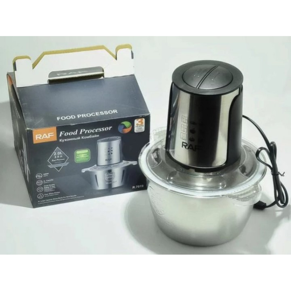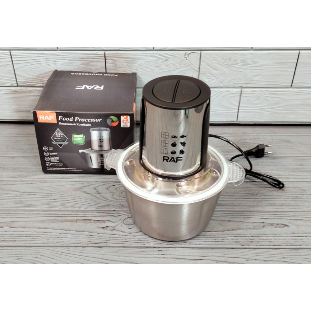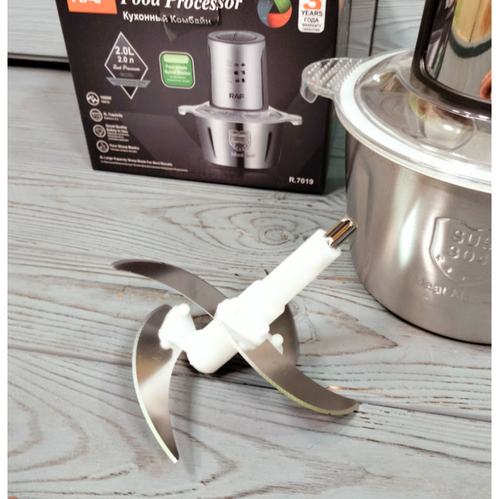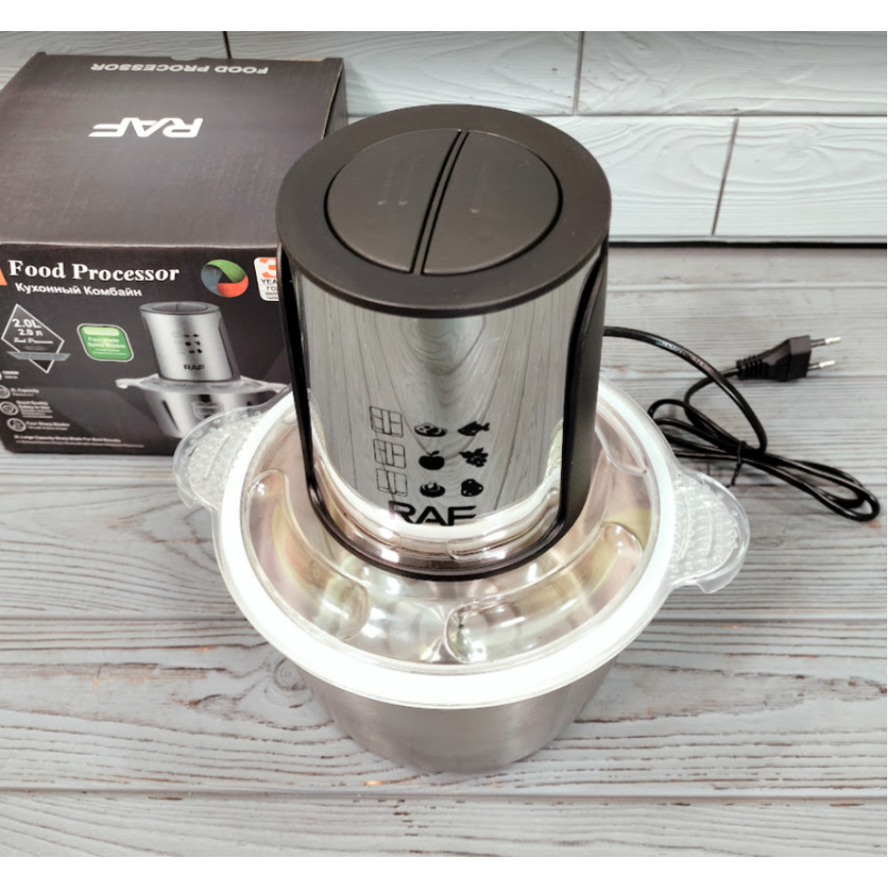 Кухонний комбайн RAF - це портативний та багатофункціональний подрібнювач, блендер, м'ясорубка, млин для швидкого подрібнення як м'яких продуктів, таких як: фрукти, перець, змішування різних соусів, яєць, так і для твердих продуктів, таких як м'ясо, овочі, зерна кукурудзи , бобові, коріння рослин, кава, боби, рис. З можливістю застосування не тільки в домашніх умовах, а й для ресторанів та барів.