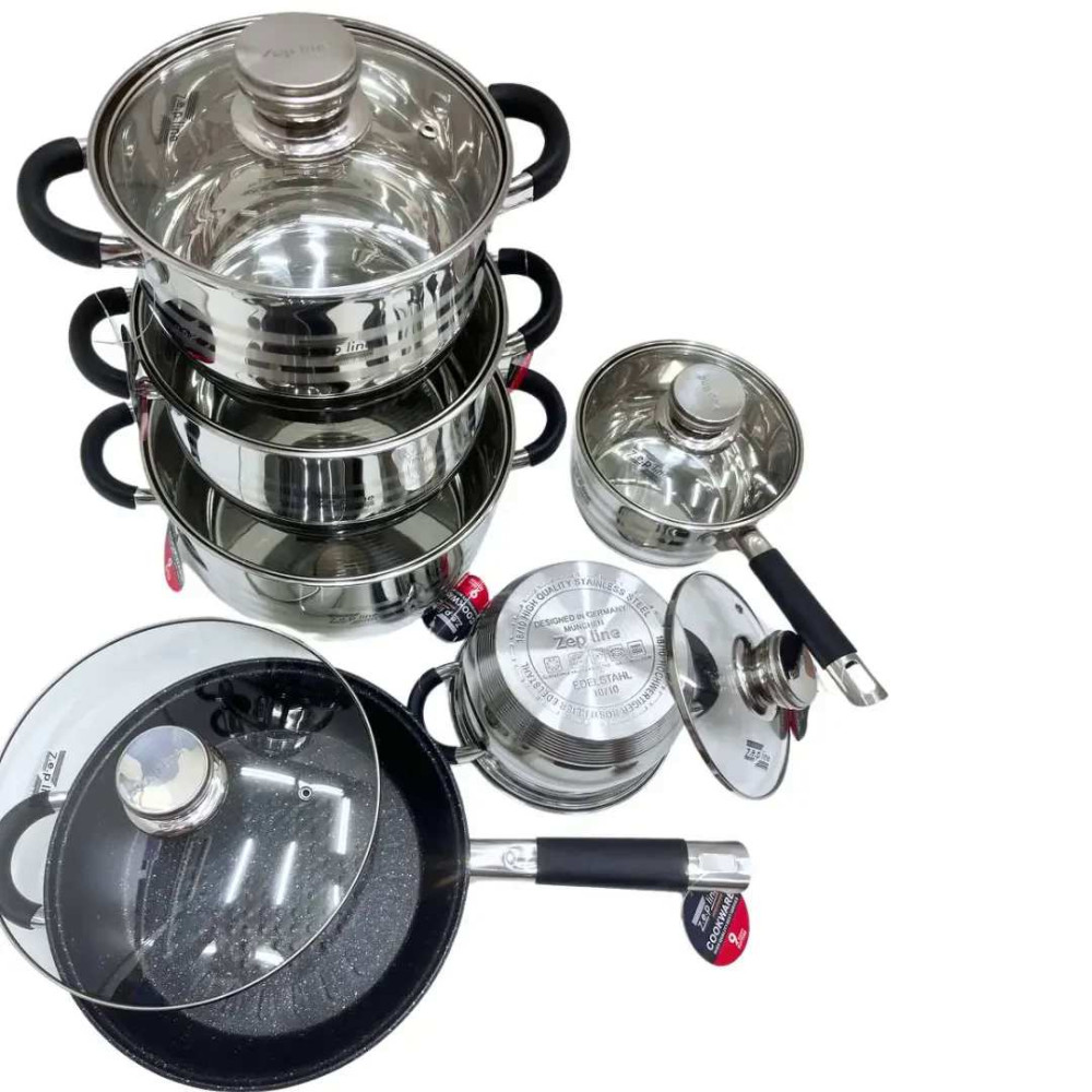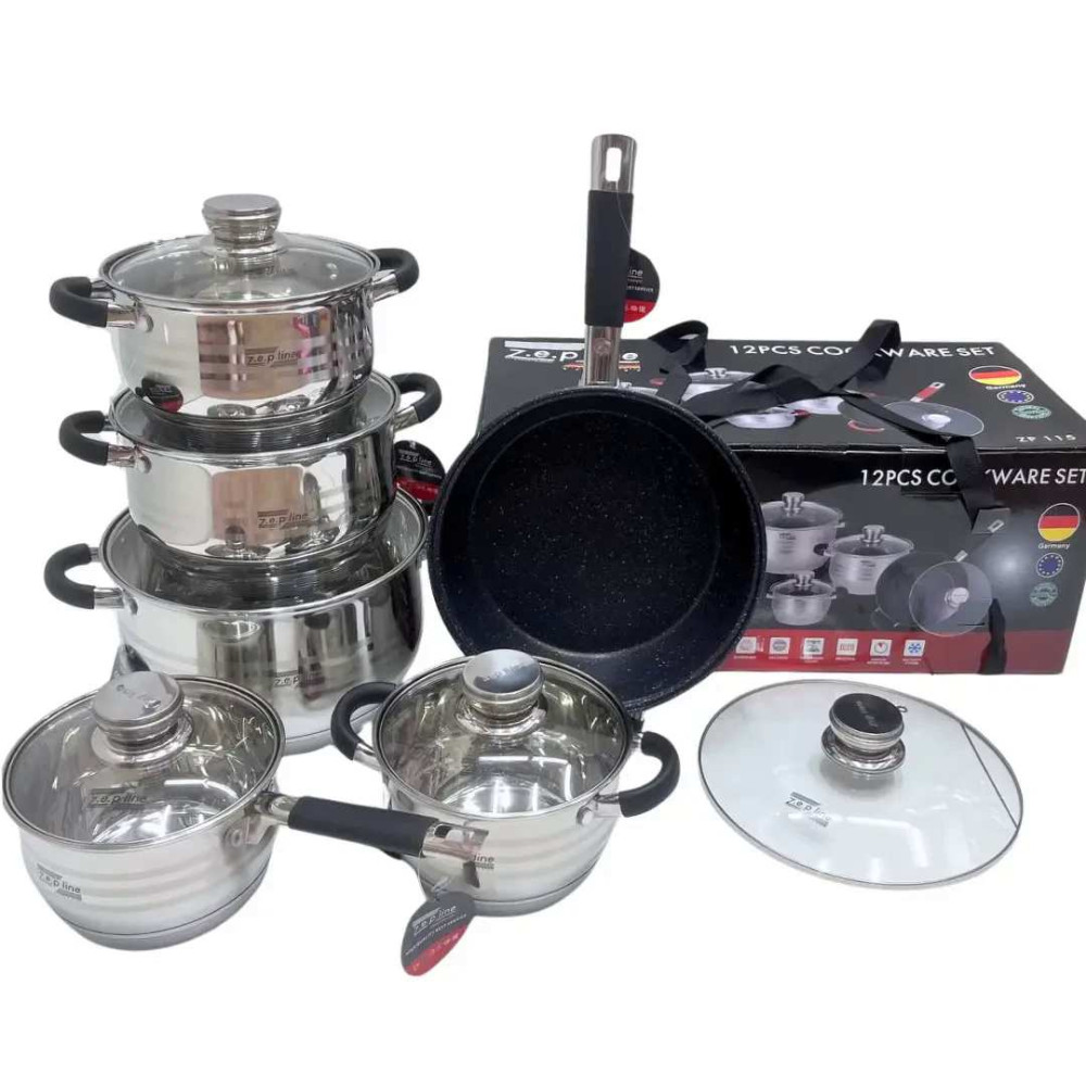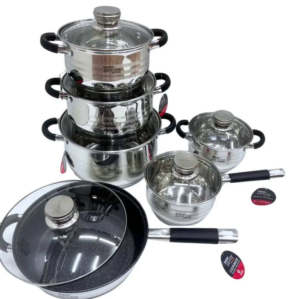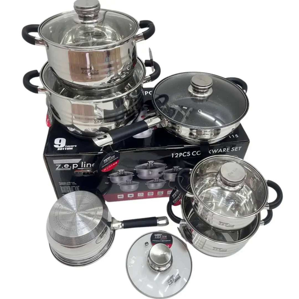 Кухонний набір посуду Zepline ZP-115 – це ідеальне рішення для тих, хто цінує якість та функціональність на кухні. У набір входить 12 предметів із міцної нержавіючої сталі, що забезпечує довговічність та стійкість до зносу. Підходить для всіх видів плит: індукційних, газових, електричних, що робить його універсальним помічником у будь-якій кухні.