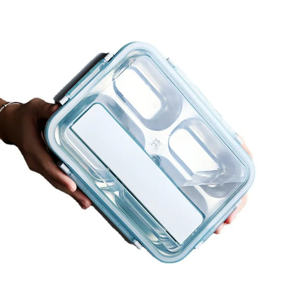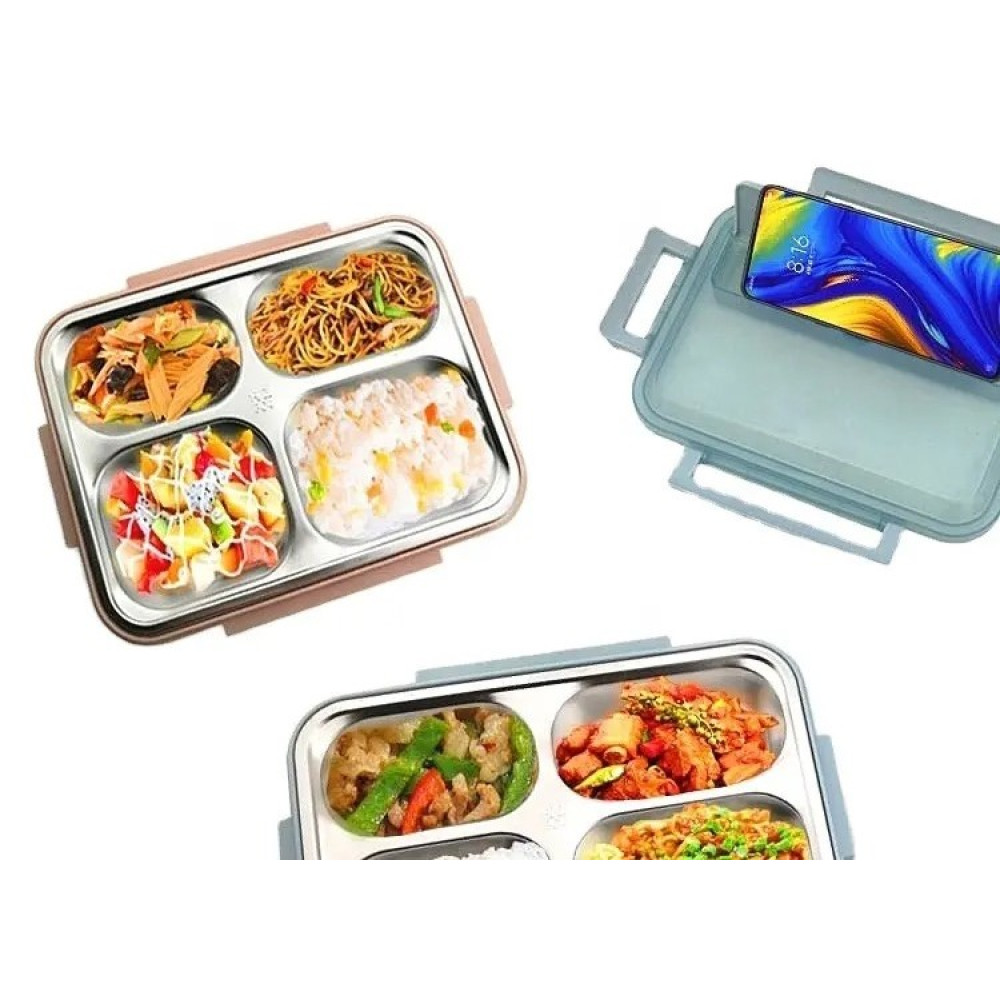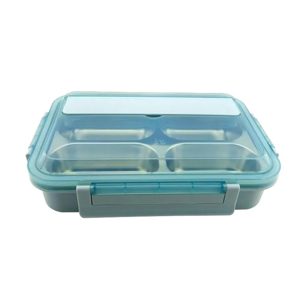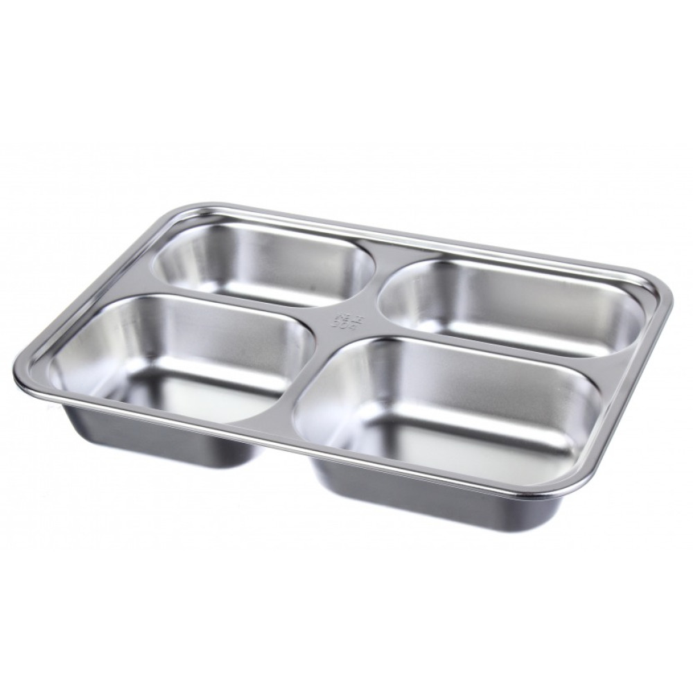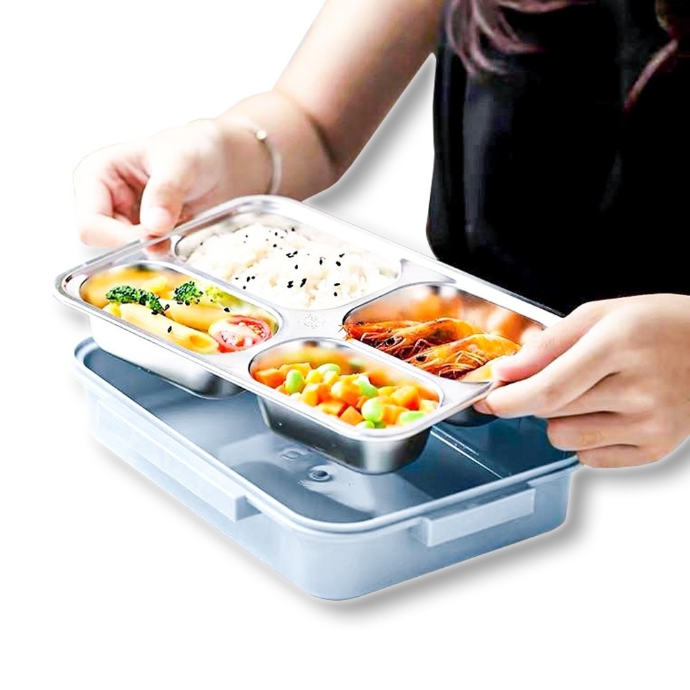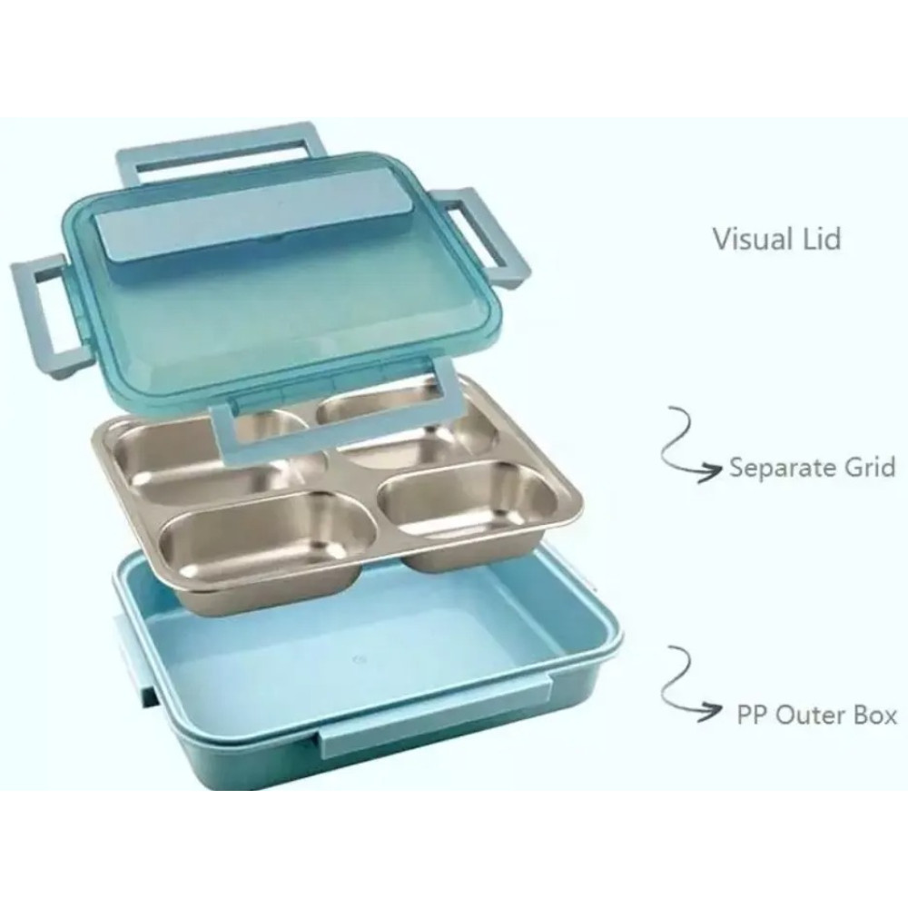 Є 4 відсіки з нержавіючої сталі. Кришка щільно закривається і фіксується за допомогою надійних бічних клямок, є зручна ручка для перенесення. Зверху кришки розташований відділ зберігання приладів. Цей ланчбокс оснащений механізмом підігріву, що працює від окропу. Ви можете легко та швидко підігрівати ваш обід, використовуючи лише окріп.