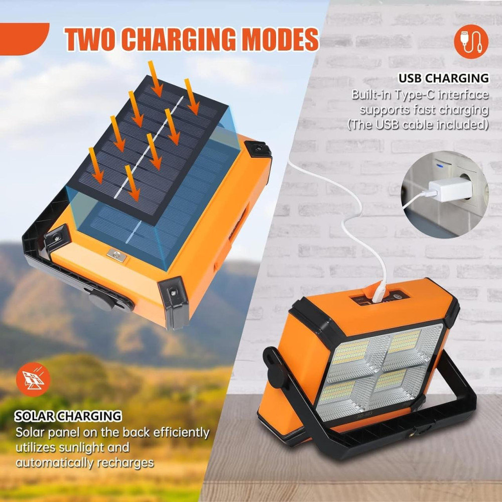 - Живлення від вбудованого акумулятора, який можна зарядити від 220 В розетки або за допомогою сонячної панелі, розташованої на обороті прожектора.