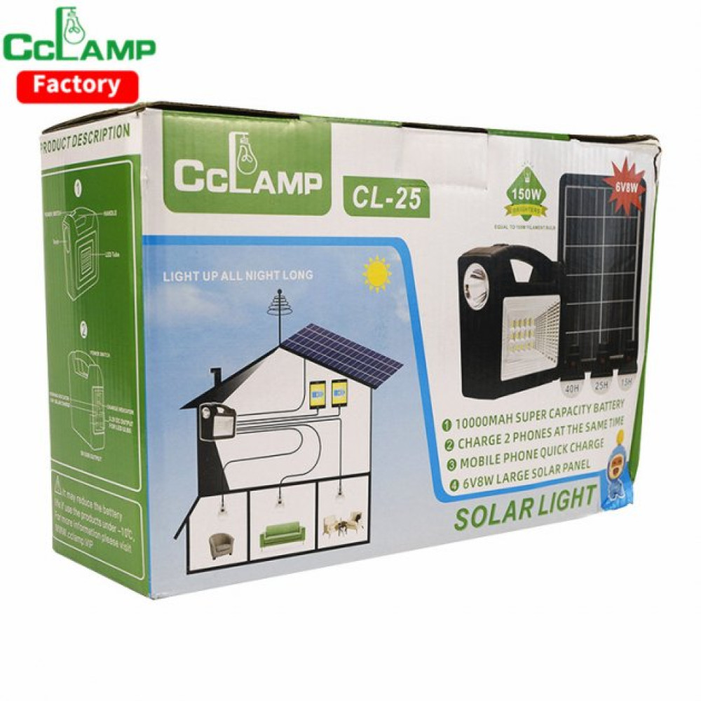 Портативну зарядну станцію ліхтар CCLAMP CL-25 можна використовувати при відключеннях електрики або без стаціонарних джерел електроенергії. З її допомогою ви можете зарядити телефон або планшет, а також забезпечити освітлення (світлодіодними лампами, що входять до комплекту) за рахунок вбудованого акумулятора та сонячної енергії. У лампочках використовуються потужні та економічні світлодіоди білого кольору. Їх яскравості досить практично для будь-яких завдань, чи читання чи приготування їжі. Також у цьому пристрої є вбудований bluetooth, MP3 плеєр, FM радіо.