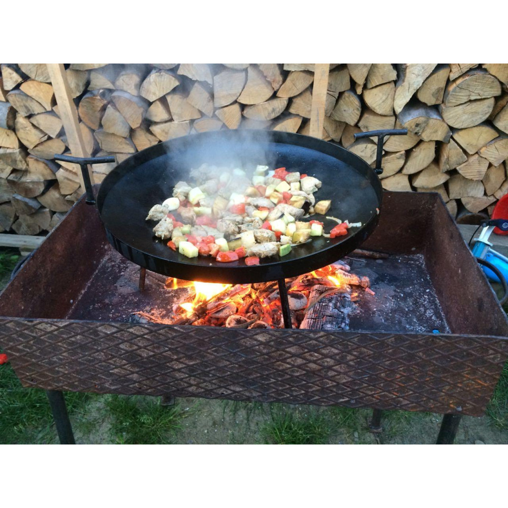 Сталева сковорода з диска призначена для використання на відкритому вогні, вона підходить для приготування м'яса, риби, морепродуктів, овочів. Страви готуються досить швидко, виходять ароматними, мають насичений смак, не підгорають.
