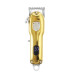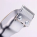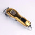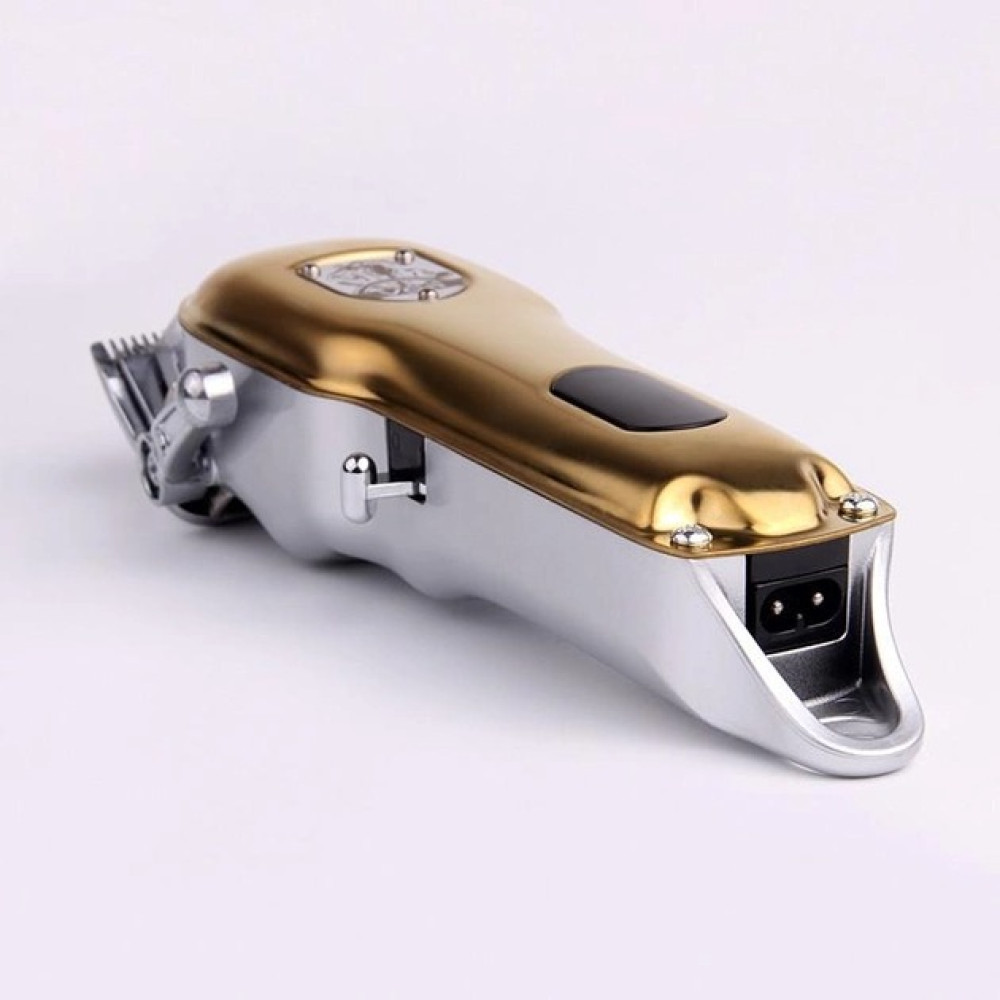Акумуляторна машинка для стрижки виконана з якісного міцного сріблястого пластику, зверху знаходиться золотиста накладка з красивим гравіюванням логотипу. ручка має вигнуту ергономічну форму, тому зручно лежить у руці, і вона не втомлюється під час стрижки. На бічній поверхні корпусу розташована кнопка вмикання, виконана в оригінальному незвичайному стилі, а ближче до головки знаходиться важільний регулятор довжини стрижки.