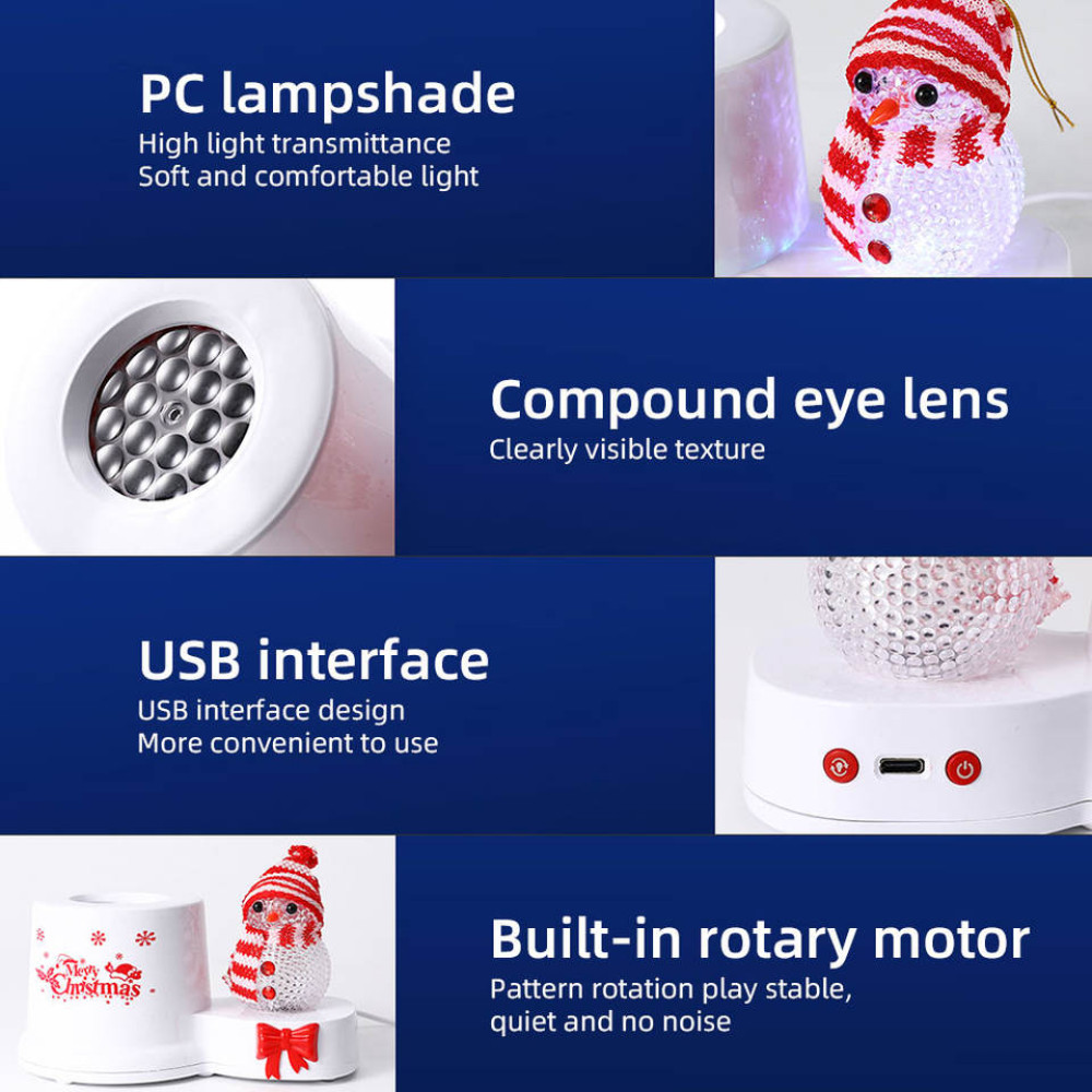 Завдяки дизайну USB-інтерфейсу різдвяних снігопадних вогнів, що обертаються, він дуже простий у використанні. Вбудований двигун, що обертається, дозволяє візерунку обертатися, не створюючи шуму.