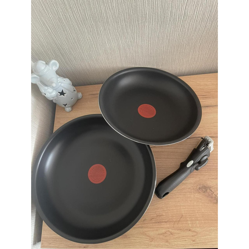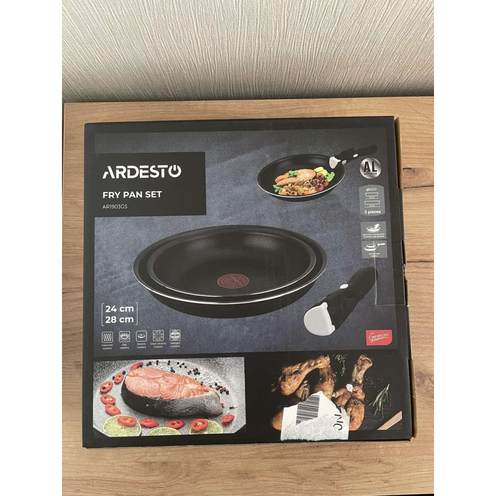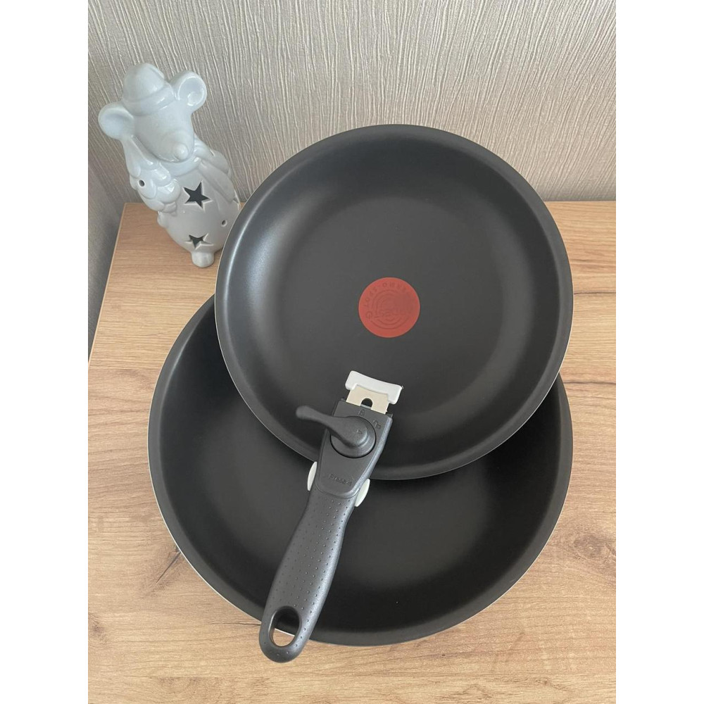 Набор состоит из трех предметов: двух сковород и съемной бакелитовой рукоятки с soft-touch-покритием. Является очень удачним решением для любителей разумно использовать свободное пространство. Сковорода изготовлена из алюминия, изнутри покрита противопригарним покритием. На дне толщиной 2,5 мм предусмотрен датчик температури.