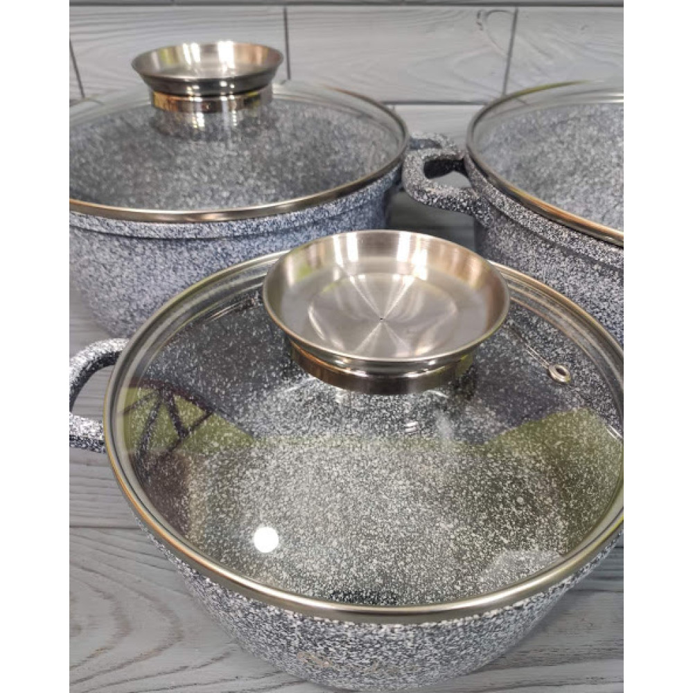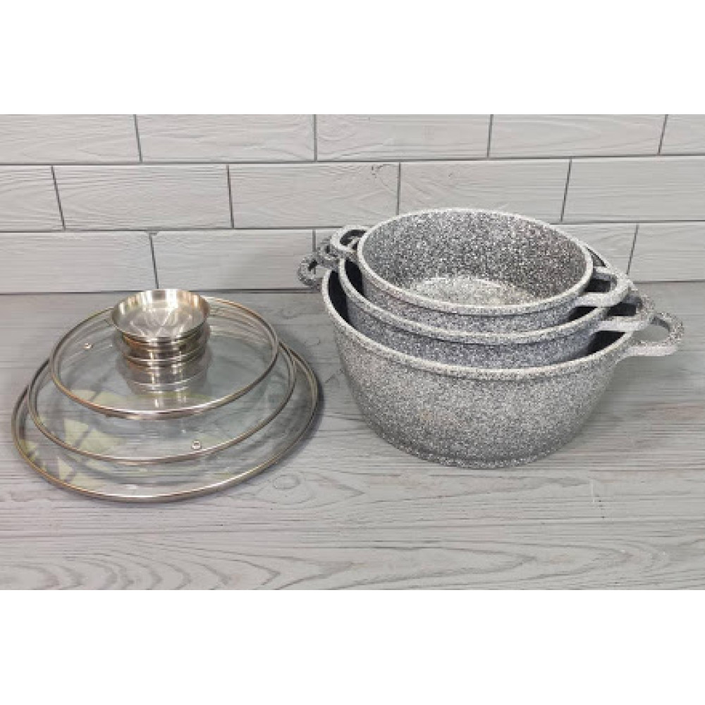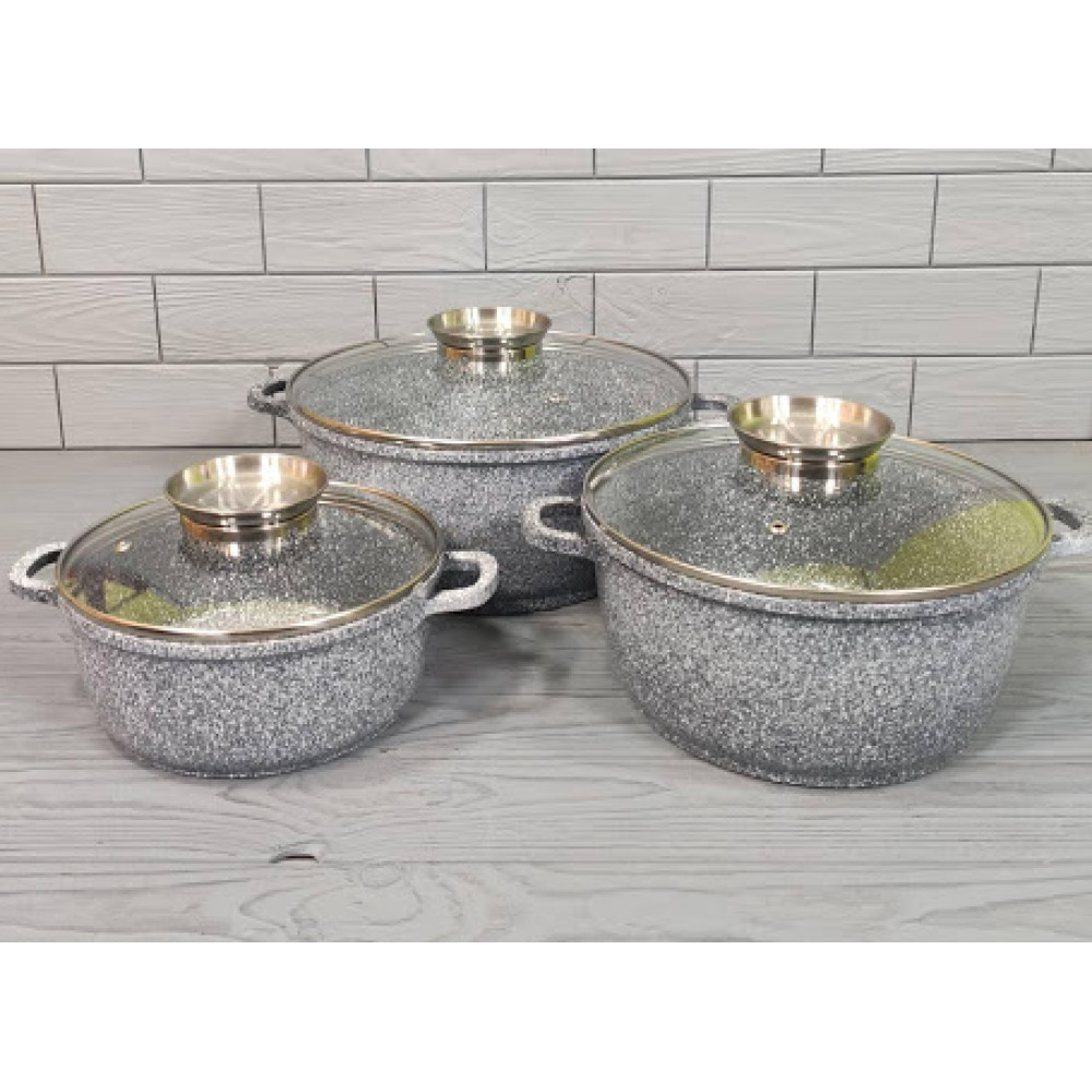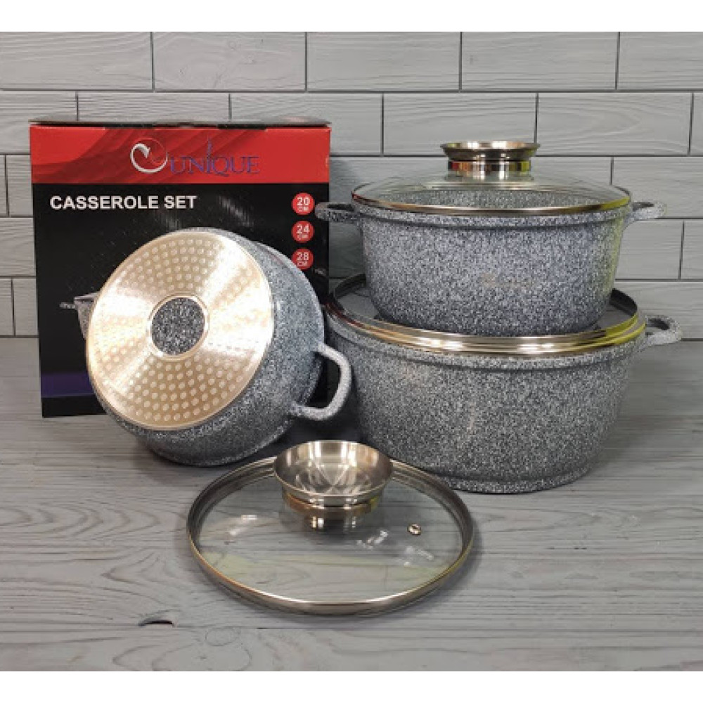 Набір із 3-х казанів UNIQUE UN-5511 із внутрішнім антипригарним покриттям має скляні жароміцні кришки. Посуд UNIQUE UN-5511 має індукційне дно, що робить їх сучасними. Тришарове антипригарне покриття не впливає на смак та запах їжі та запобігає пригоранню. Цей кухонний набір не містить шкідливих речовин у своєму складі та дозволяє готувати їжу з мінімальною кількістю олії. Ідеально для приготування низькокалорійної, дієтичної їжі.