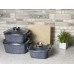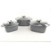Набір з трьох каструль-сотейників із зовнішнім та антипригарним покриттям з мармуру. Набір посуду є унікальним тим, що форма сотейників (каструль) квадратна, що досить зручно при використанні для запікання птиці або м'яса. Крім того, кожна каструля має скляні кришки з дозатором для олії, завдяки чому ви можете постійно заливати масло в тримач під час приготування або гасіння.