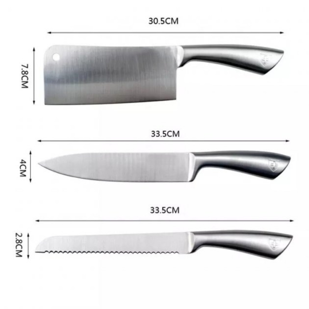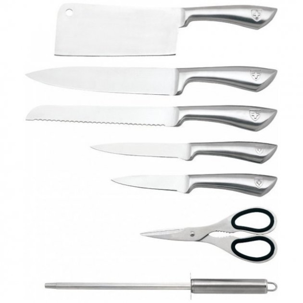 <p>Ніж топірець (17,5 см) - 1 шт.<br>Ніж кухарський (20 см) - 1 шт.<br>Ніж для хліба (20 см) - 1 шт.<br>Ніж універсальний (12, 5 см) - 1 шт.<br>Ніж для чищення овочів (8,75 см) - 1 шт.<br>Точилка Муссат (18,75 см) - 1 шт.<br>Ножиці - 1 шт.<br> Овочечистка - 1 шт.<br>Підставка - 1 шт.</p>
