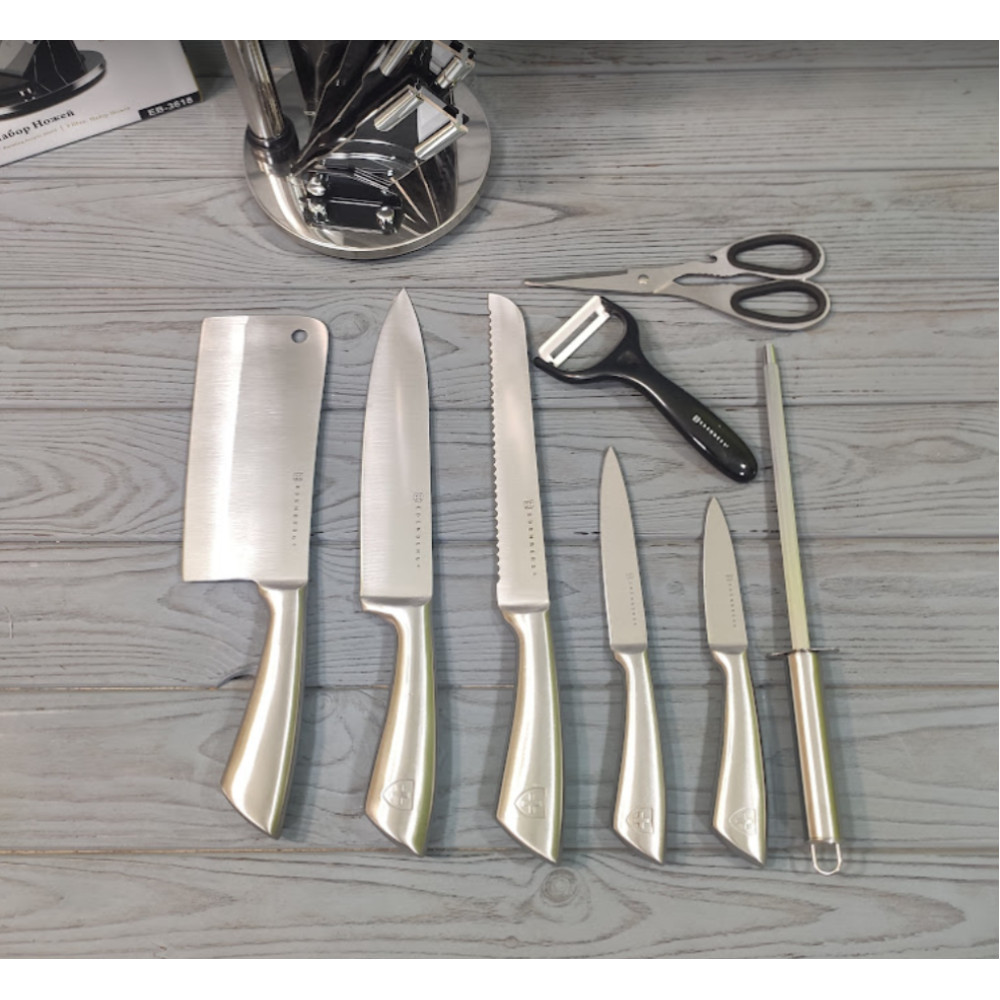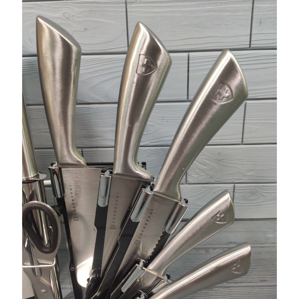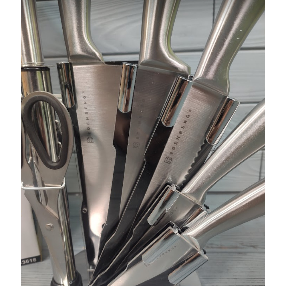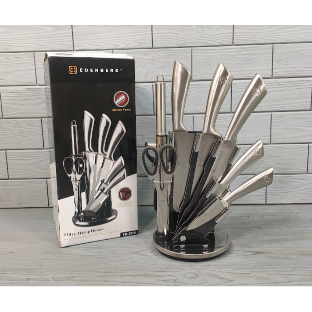 - Набір ножів Edenberg EB-3618 Влучний набір з дев'яти речей. Такий стильний дизайн прикрасить інтер'єр кухні і придасть вишуканості будиночку. Оригінал зберігання кухонних ножів надає особливого вигляду.