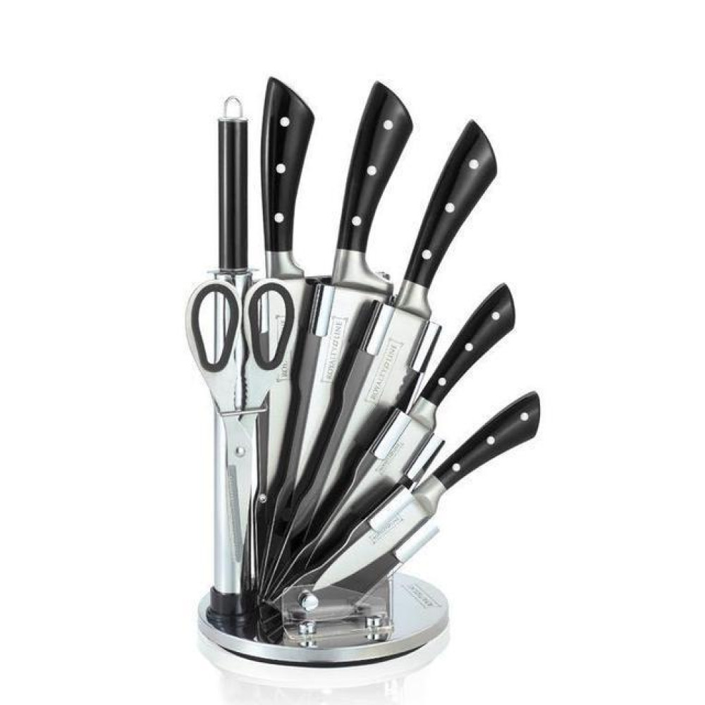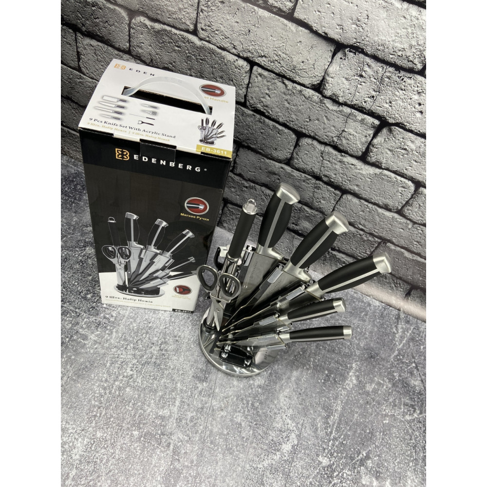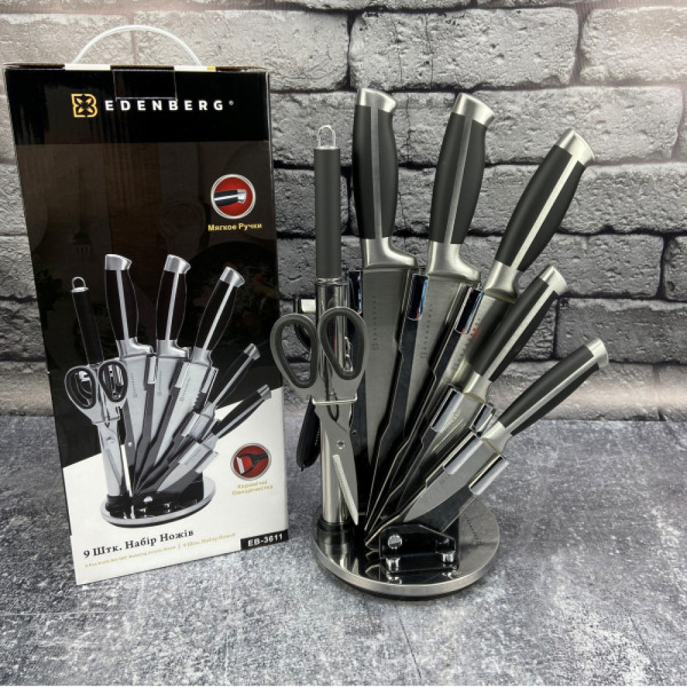 Набір ножів Edenberg EB-3619 стане вигідним оновленням для вашої кухні. Він складається з п'яти ножів, ножиць, точилки, овочечистки та підставки, призначених для різних випадків. Підставка виконана із пластику. У наборі практично всі ножі на всі випадки. Вироби розроблені з перевіреного та довговічного матеріалу – нержавіючої сталі. Ергономічна ручка забезпечує зручний хват. Ножі мають спеціальний кут заточування, особливу форму, що забезпечує зручність при нарізуванні та обробці продуктів. Легкість і маневровність запобігають виникненню втоми в руках. Кожен із предметів набору бездоганно впорається зі своїми функціональними обов'язками.