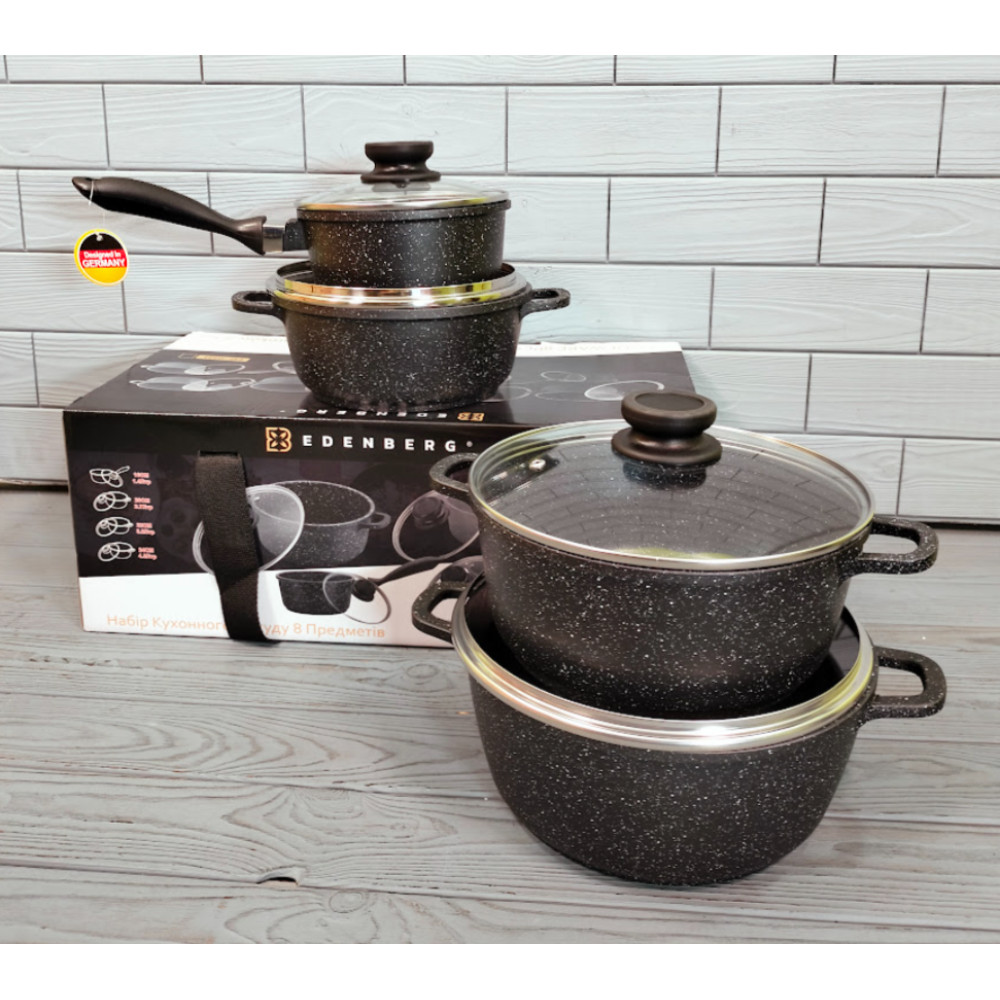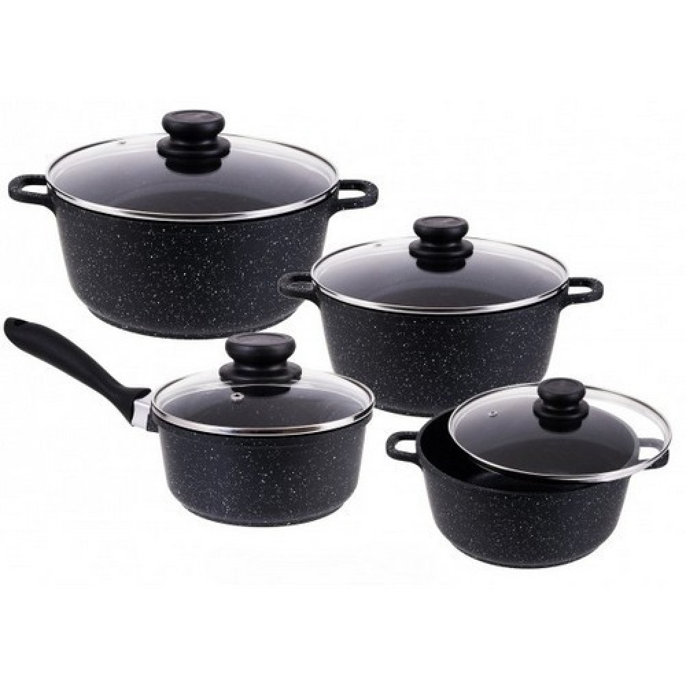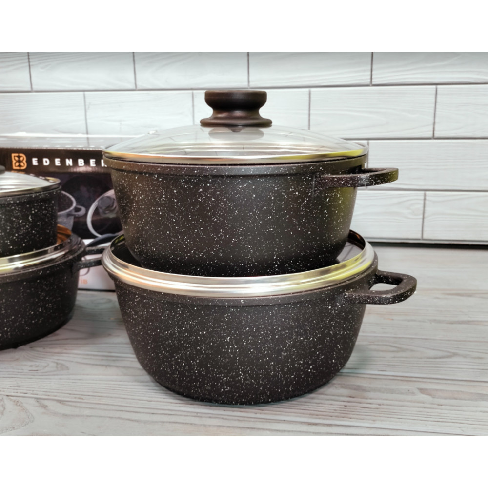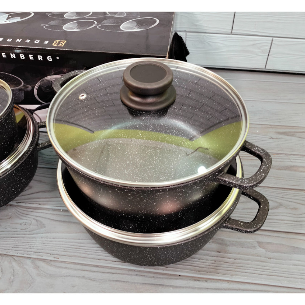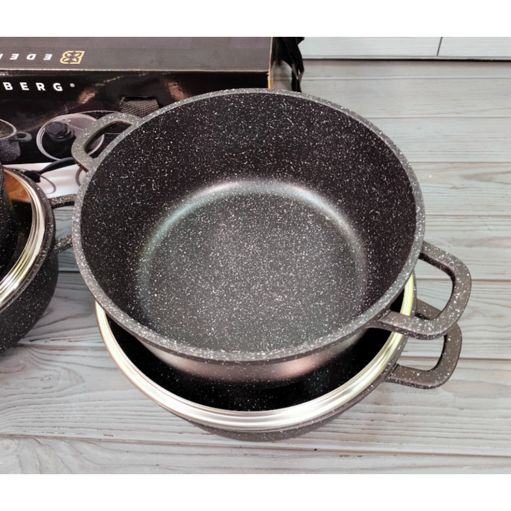 Це вигідний та якісний набір посуду. Посуд виконаний з високоякісного та безпечного для здоров'я алюмінію, що відрізняється міцністю. Цей матеріал не впливає на смак їжі і не виділятиме шкідливих речовин навіть за високої температури. Вироби прослужать Вам довго, та ефективно – корпус має гарний захист від деформацій та пошкоджень.