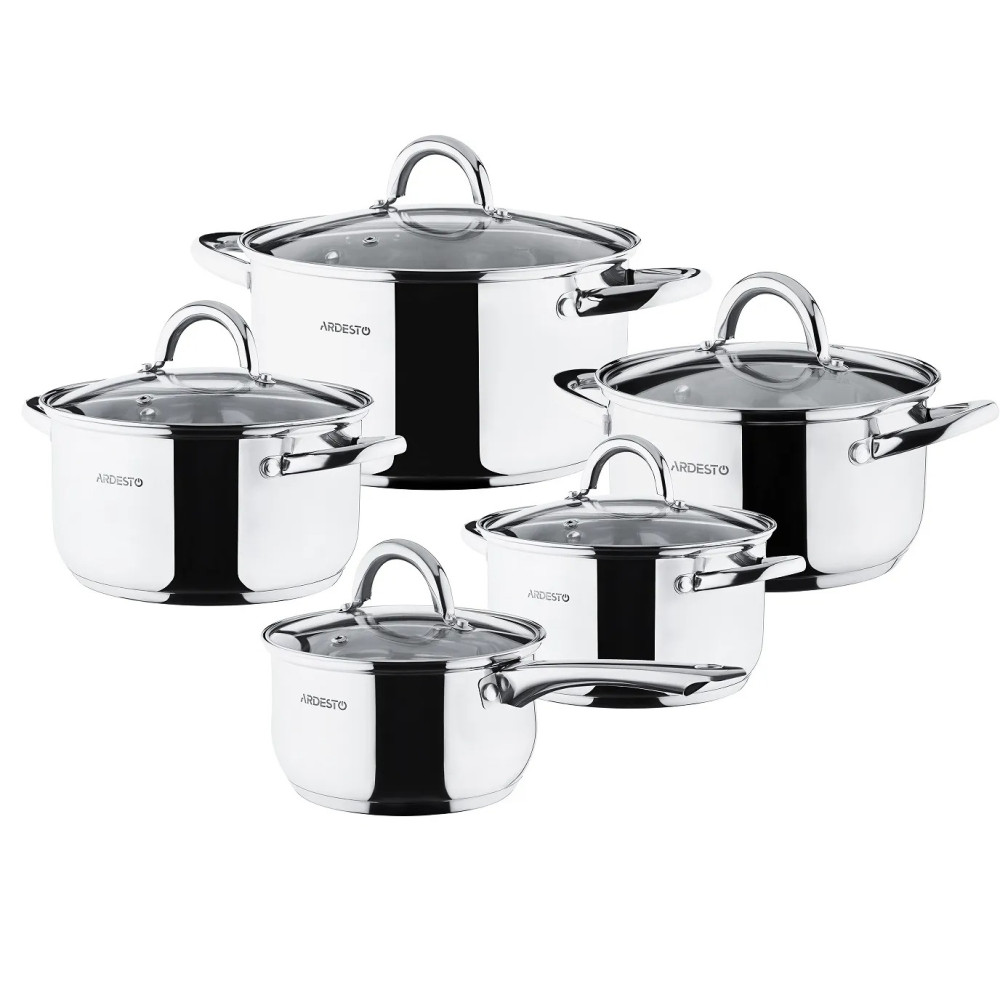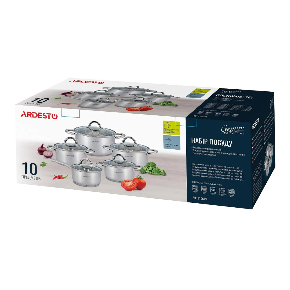 Посуд із набору серії Gemini Gourmet Andria виготовлений з нержавіючої сталі. Посуд поставляється зі скляними термостійкими кришками з відвіром для пари і сумісна зі всіма видами плит, включаючи індукційну. Для очищення посуду можна використовувати посудомийну машину.