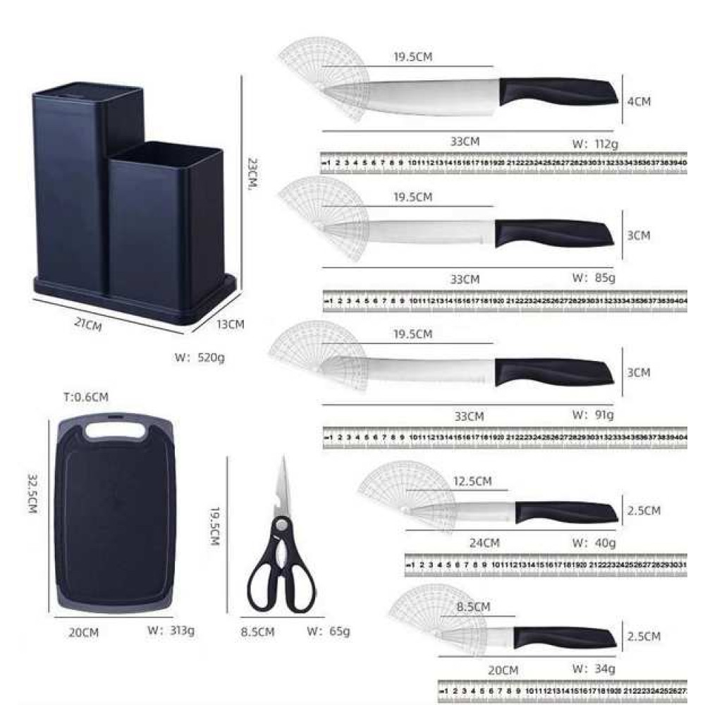 Рукоятки ножів та ножиць виготовлені із пластику. Також у наборі є обробна дошка, яка зручно розміщується на підтавці разом з рештою приладдя.