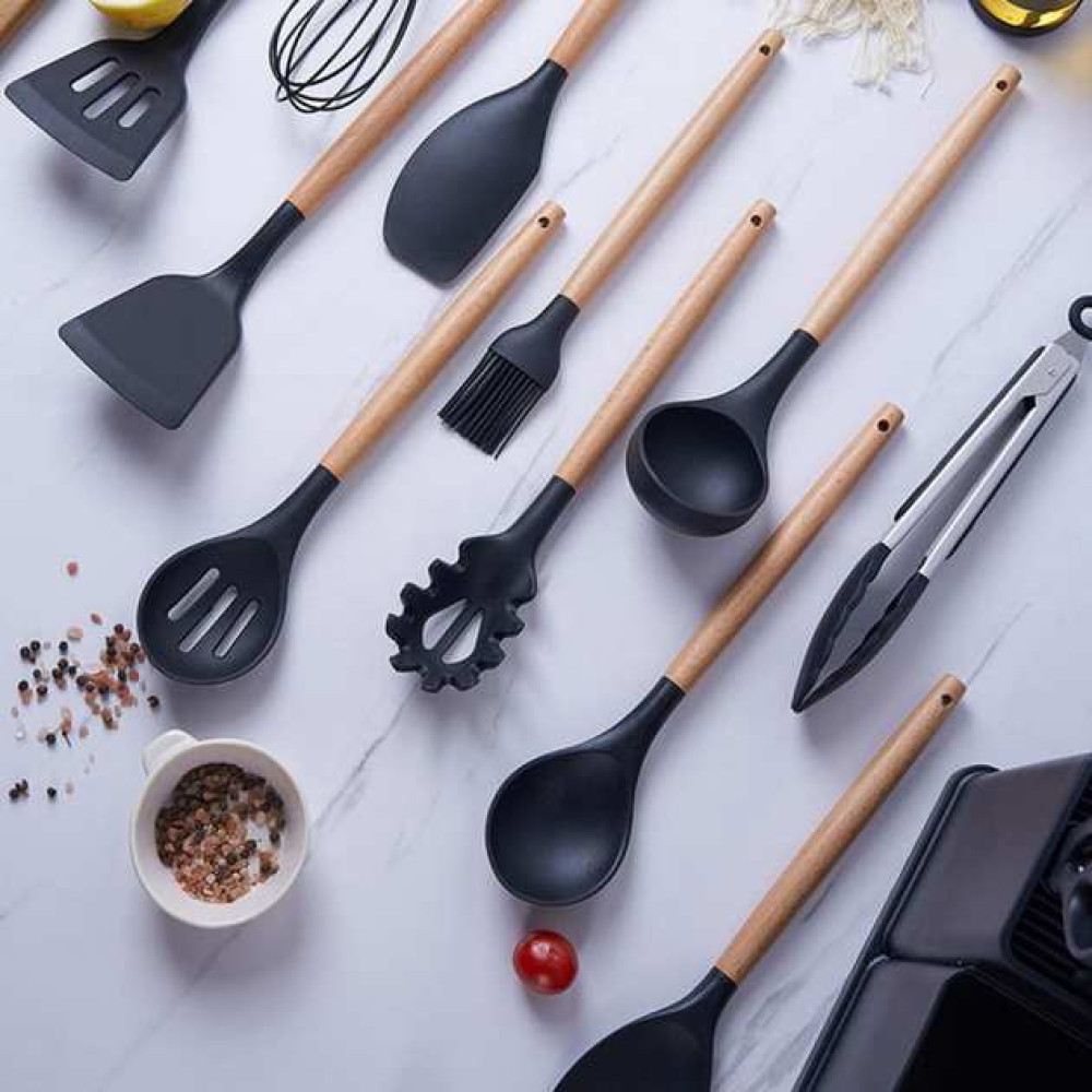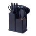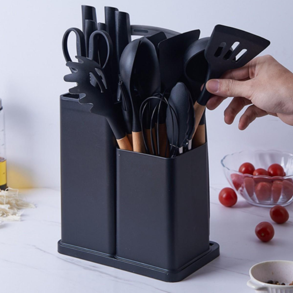 Кухонний набір на підставці з 19 предметів (включаючи подвійну ергономічну підставку) виготовлений з якісного матеріалу, який не піддається корозії, не змінює колір і не впливає на смакові якості страв.