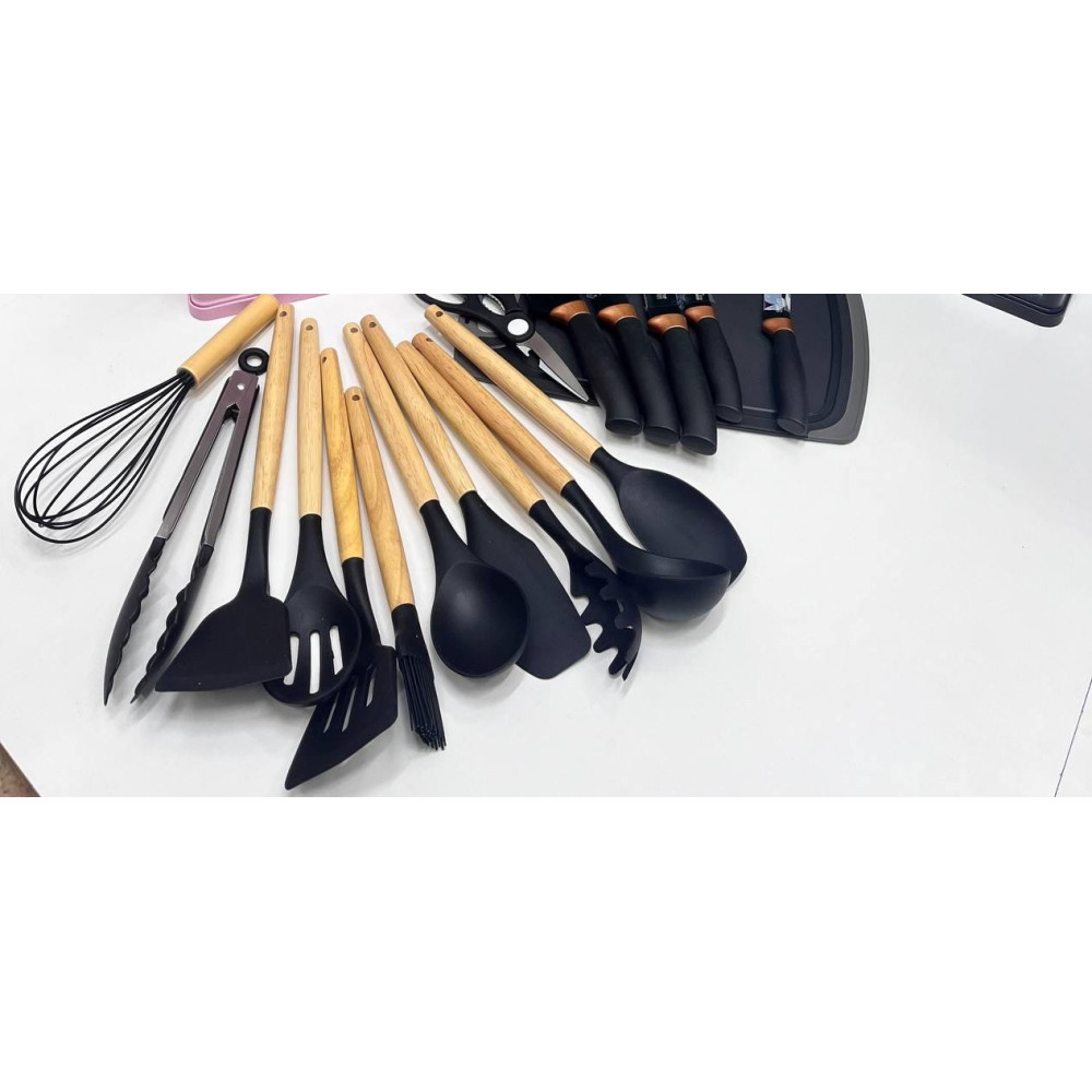 Набір включає 11 силіконових кухарів, здатних витримувати температуру до 230 градусів, зі зручною ручкою з бамбука. Крім того, представлений повний комплект ножів: