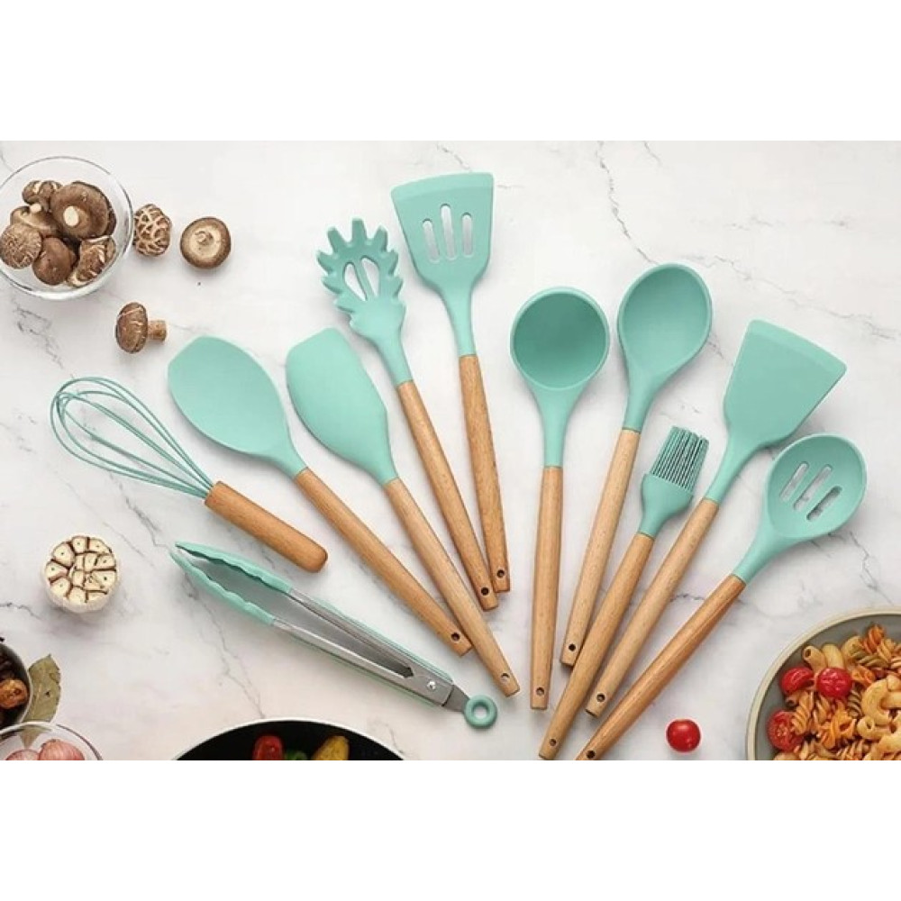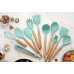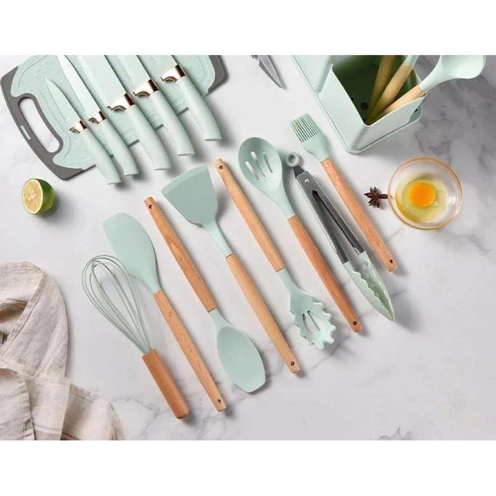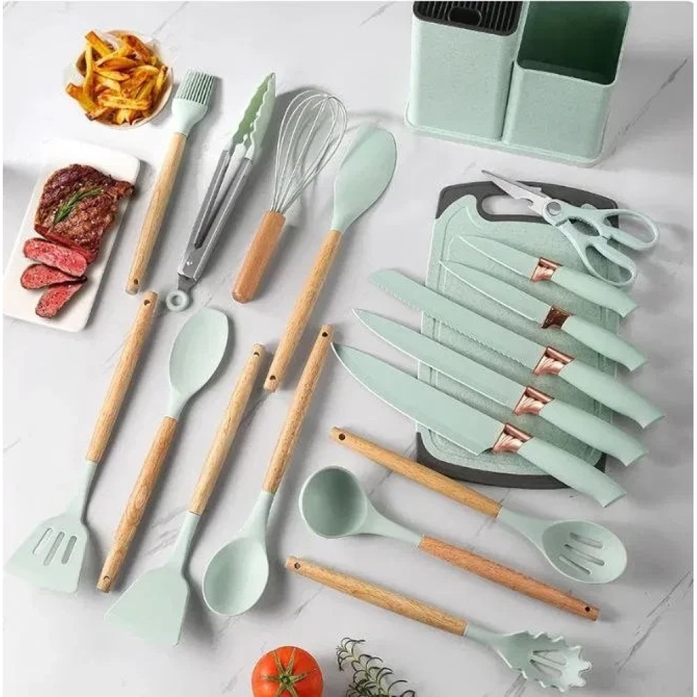 Набір включає 11 силіконових кухарів, здатних витримувати температуру до 230 градусів, зі зручною ручкою з бамбука. Крім того, представлений повний комплект ножів: