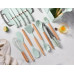 Леза виготовлені з нержавіючої сталі, покриті фарбою для додаткової міцності та стійкості до корозії. Комплект також включає зручну подвійну підставку для ножів, що забезпечує акуратне зберігання і легкий доступ до всіх елементів.