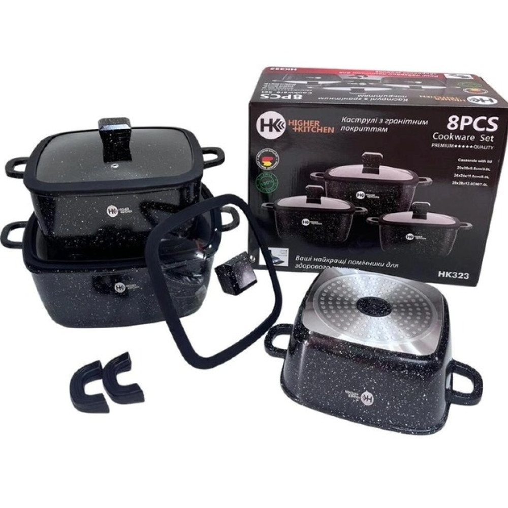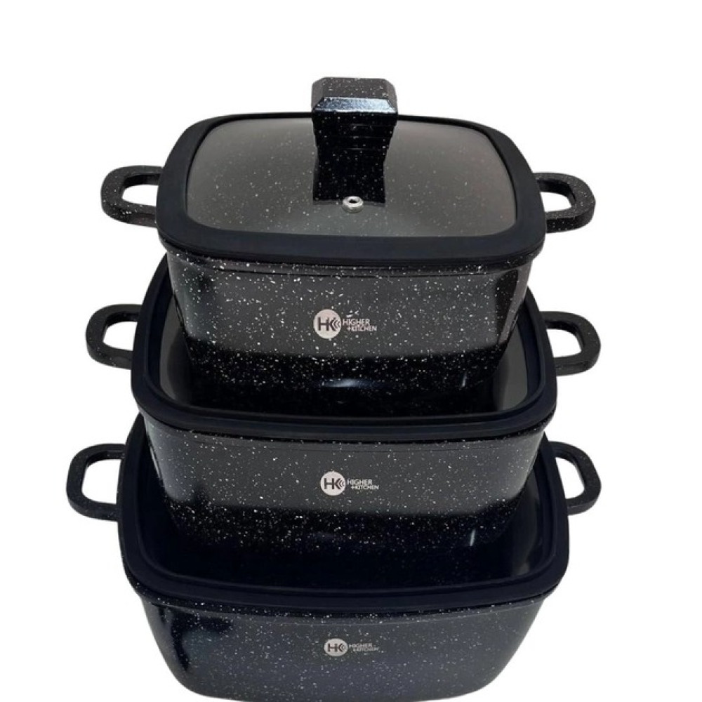Набір каструль, який випускає німецький бренд Higher Kitchen, завоював довіру покупців. Складається з 3-х квадратних казанів з гранітним антипригарним покриттям. Ця модель посуду – якісний варіант від компанії HIGH-Kitchen. Набір виконаний із міцного та екологічно чистого алюмінію – безпечного для здоров'я матеріалу, який не викликає алергію та не виділяє шкідливих речовин у їжу навіть за високої температури.