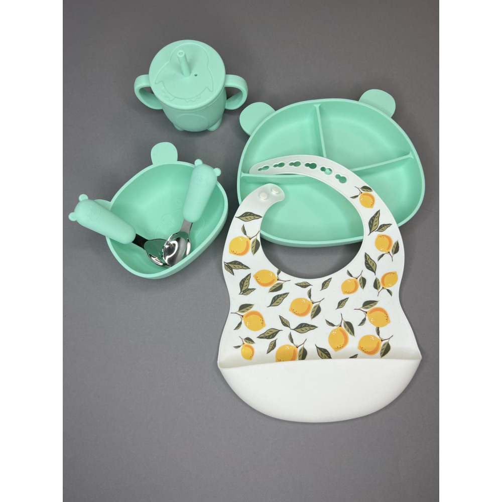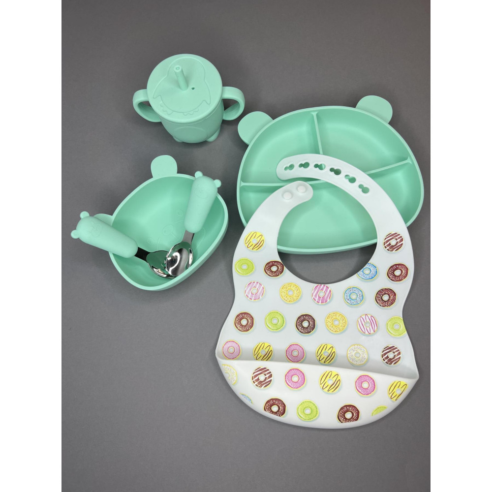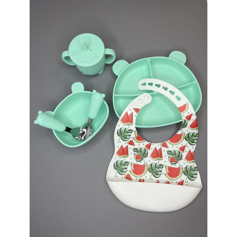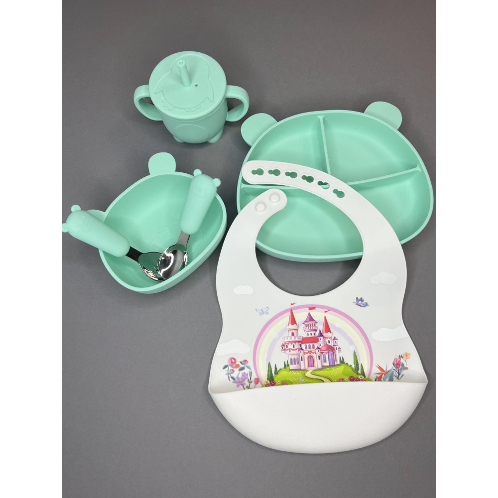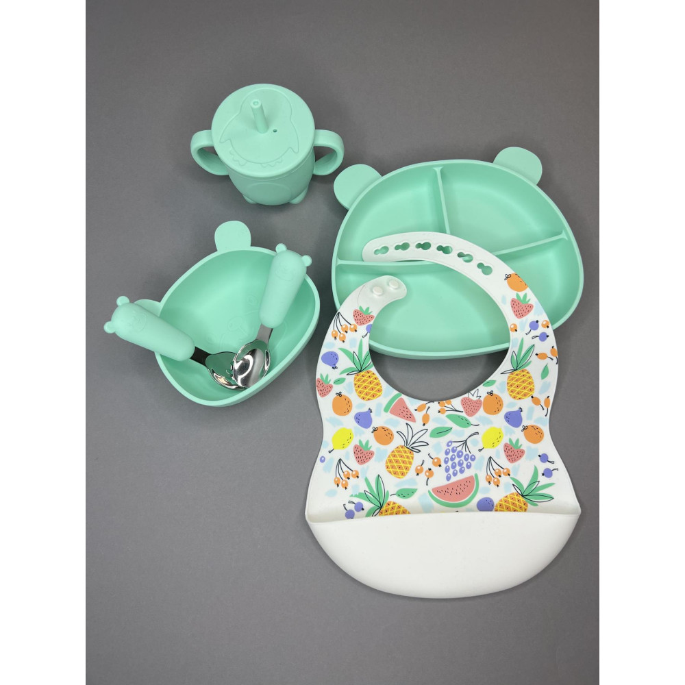 Набір силіконового посуду, для дитини від 4х місяців до 5ти років. Колір - м'ята. Це повноцінний комплект дитячого посуду для першого застосування.