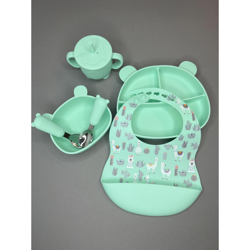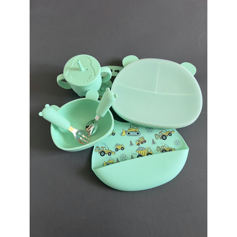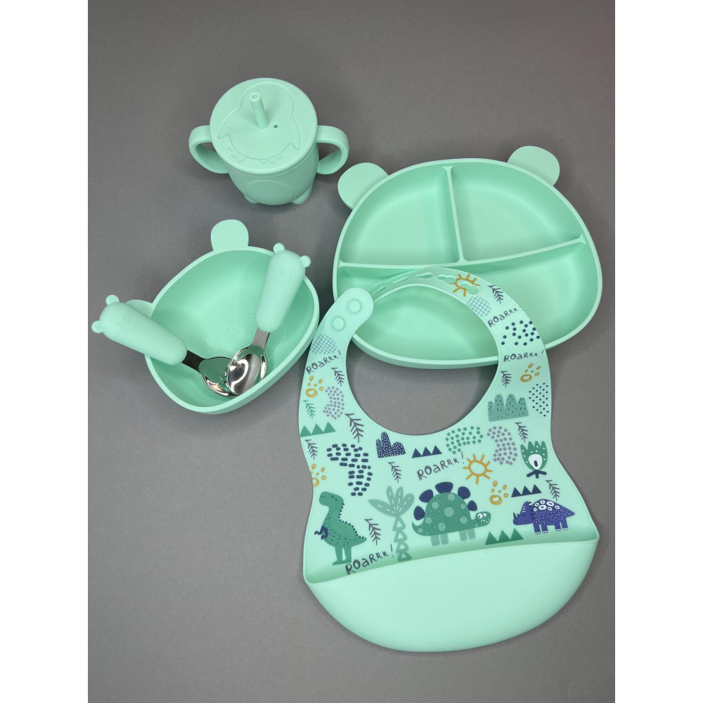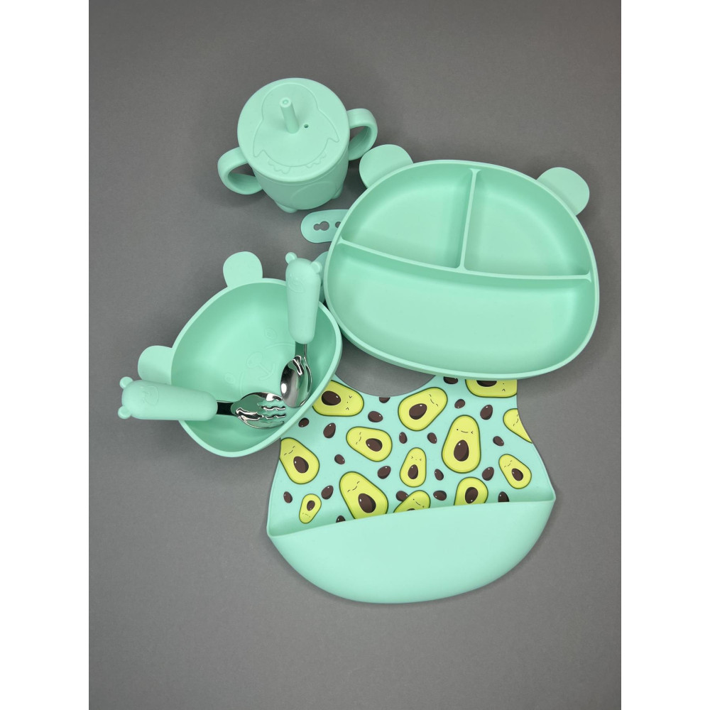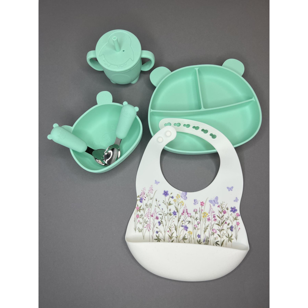Набір силіконового посуду, для дитини від 4х місяців до 5ти років. Колір - м'ята. Це повноцінний комплект дитячого посуду для першого застосування.