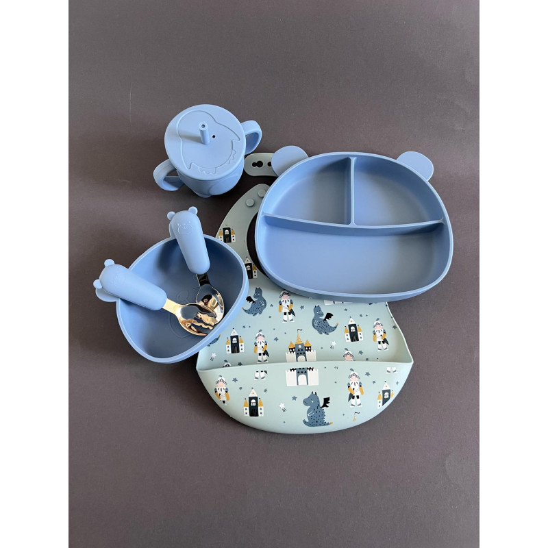 Набір силіконового посуду, для дитини від 4х місяців до 5ти років. Колір - Синій. Це повноцінний комплект дитячого посуду для першого застосування.