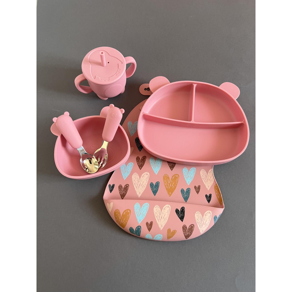 Набір силіконового посуду, для дитини від 4х місяців до 5ти років. Колір - Рожевий. Це повноцінний комплект дитячого посуду для першого застосування.