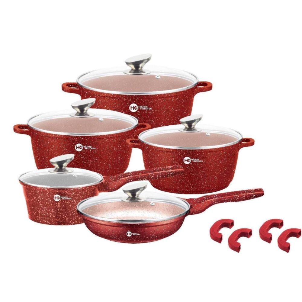 Набір кухонного посуду Higher Kitchen - це посуд з екологічно чистого матеріалу литого алюмінію, що має високу теплопровідність, гігієнічність і довговічність. Дно каструль 5-ми шарове, термоакумулююче, що не деформується, забезпечує рівномірну теплопровідність, швидкий розподіл і тривале утримання тепла, завдяки чому значно знижується ризик пригорання їжі.