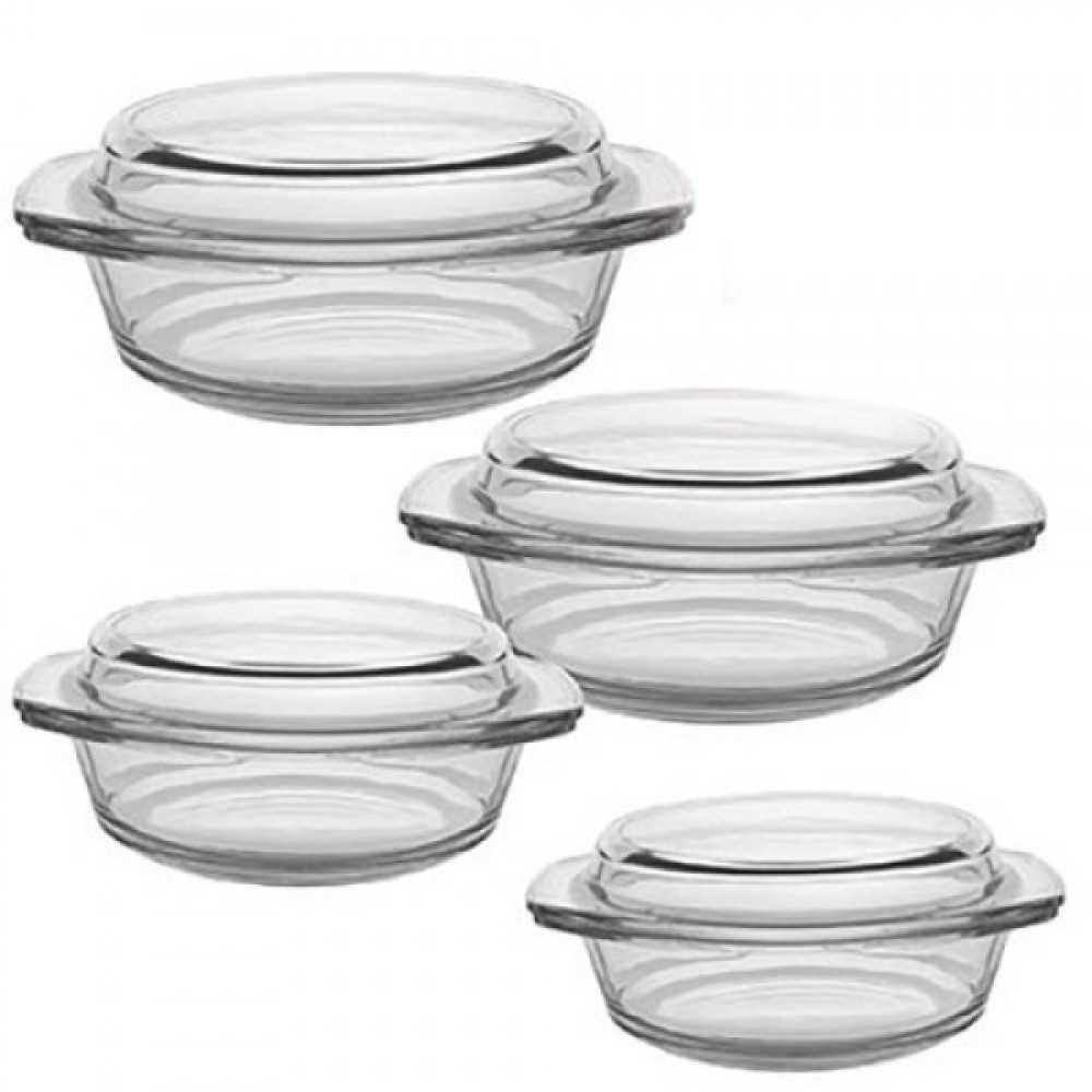 В комплект входять 4 якісних, скляних термокастрюль з кришками різного об'єму і форми.