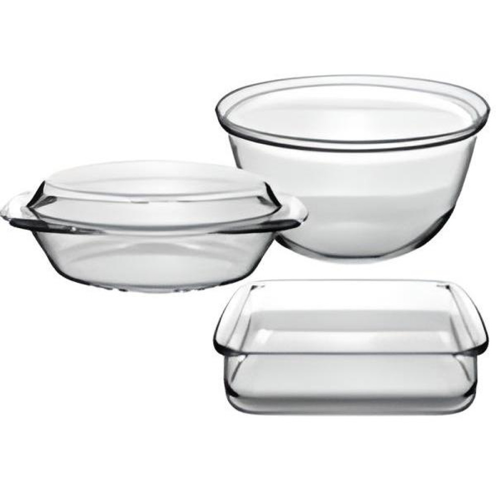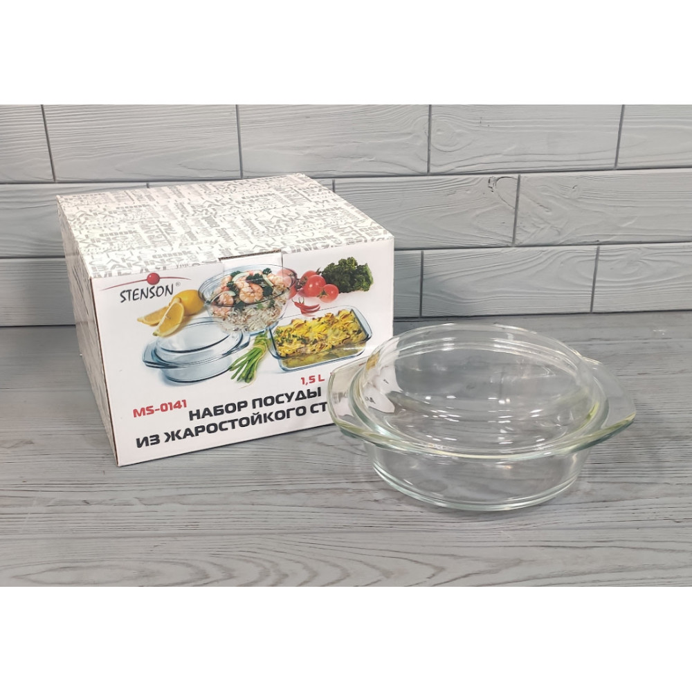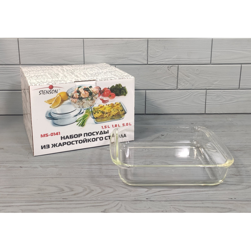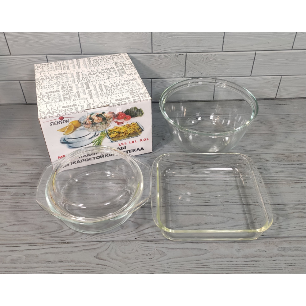 - Набір скляних форм від фірми Stenson. У набір входить лист, каструля з кришкою і глибокий салатник: 1.5 л, 1.8 л і 5 л